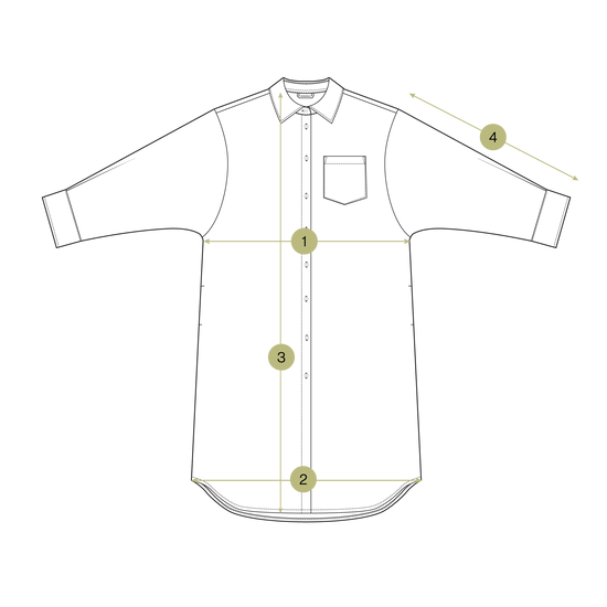 The Nova Dress is an ankle-length, oversized shirt dress that features a standard collar and a front placket finished with Tagua nut buttons. It has a drop shoulder and exaggerated batwing sleeve, it can be worn loose or cinched at the waist with the self-fabric tie. Made in organic cotton poplin.