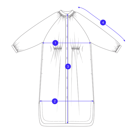 A relaxed shirt dress, made from organic cotton poplin. The Wander Dress is a below-the-knee style defined by gathers around the neckline and on either side of the waist for subtle shaping. It has a band collar and contrast Agoya shell buttons. Side splits and a rounded hem ensure ease of wear.