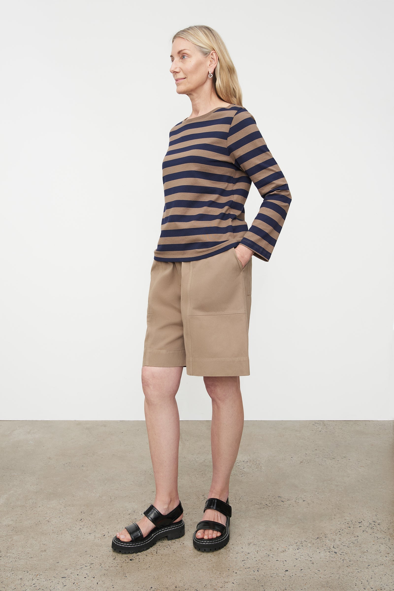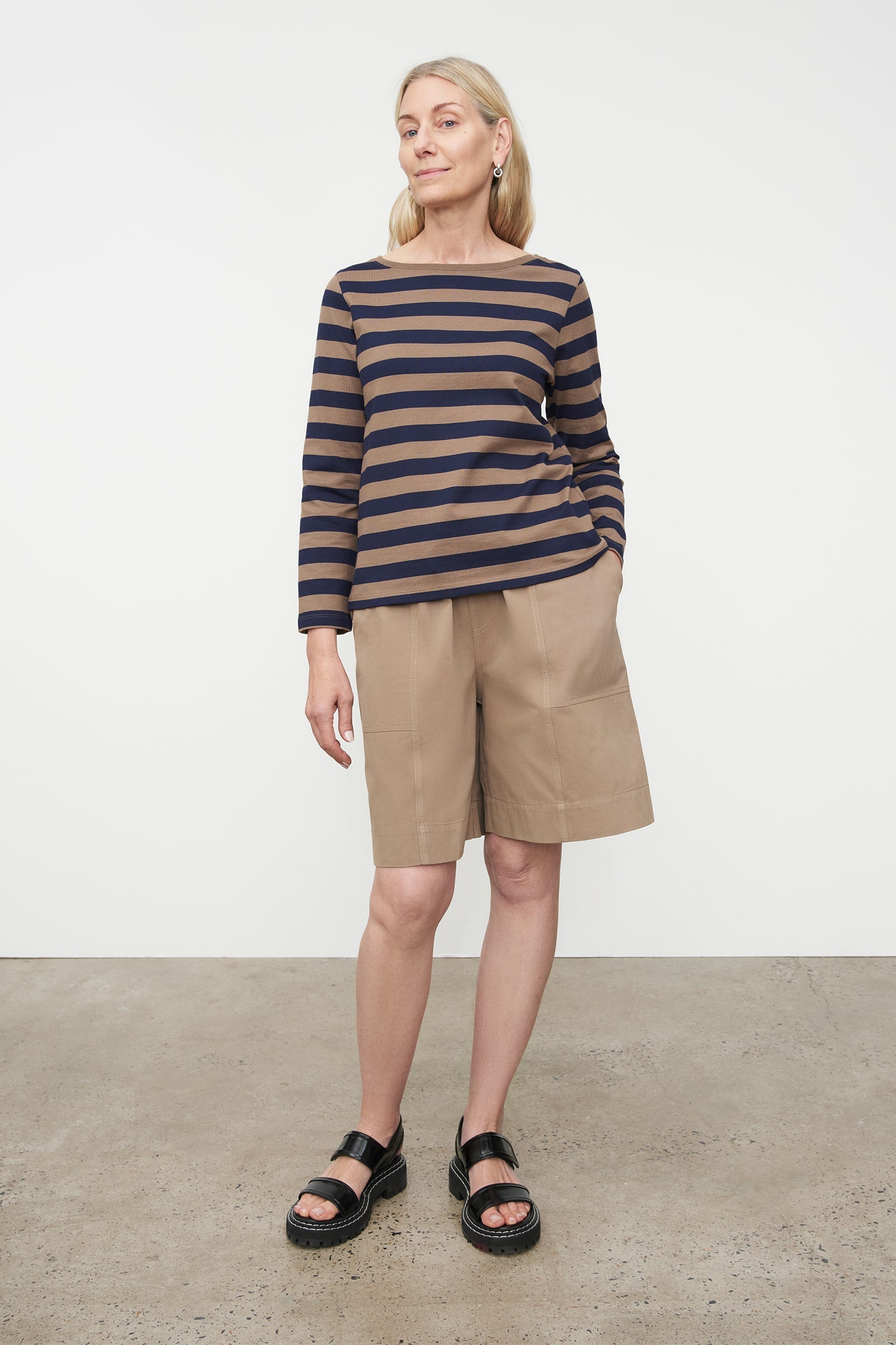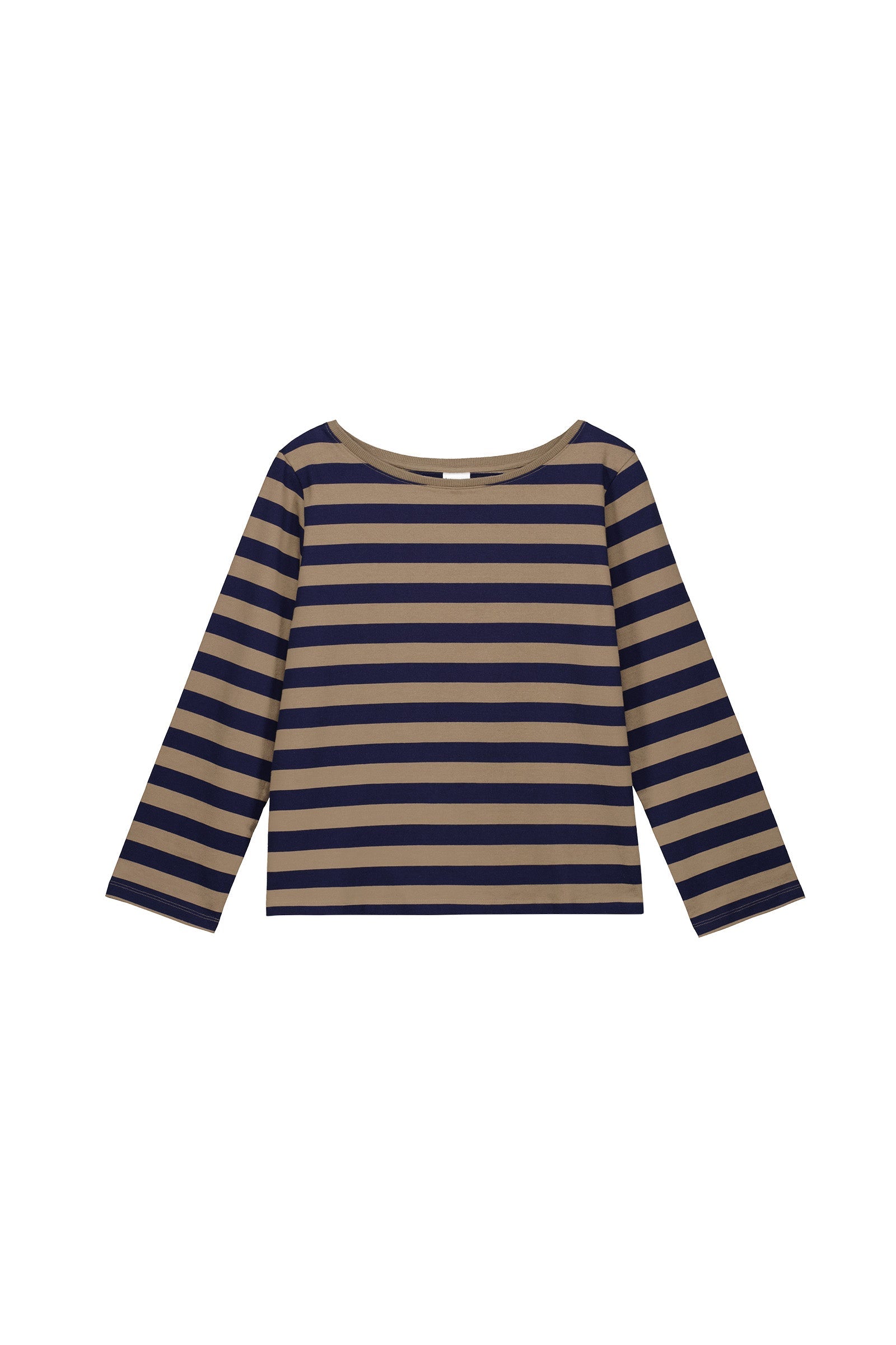 A classic breton stripe top, finished with a wide boat neckline. A versatile piece with a relaxed fit, that can be worn on its own, or as a light layer. Made from 100% certified Fairtrade heavy-weight organic cotton jersey in a navy and taupe stripe.