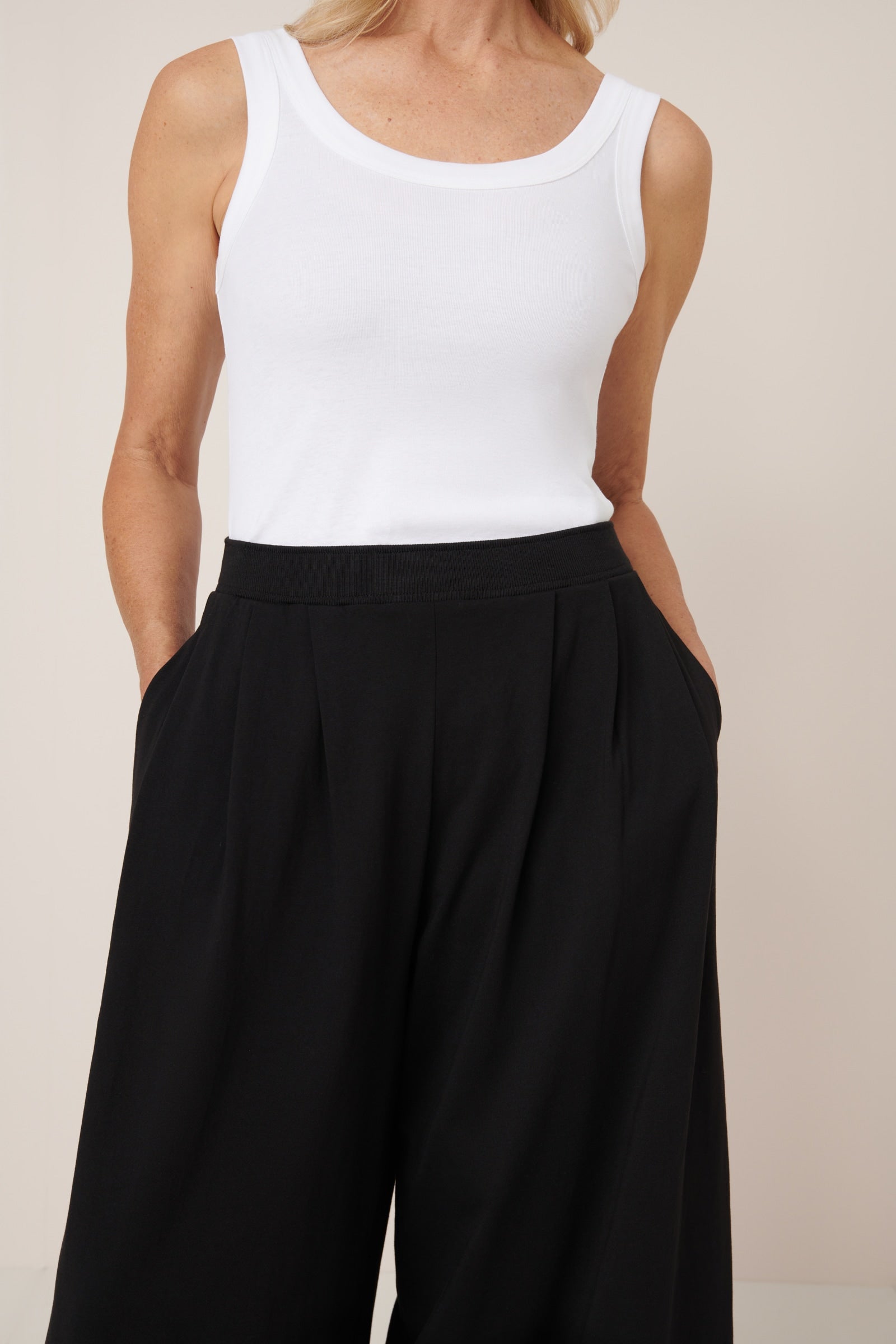 Our best-selling style, the Drape Pant, is a full-length, wide-leg pant that features elegant front pleats and is finished with a wide, ribbed elastic waistband and convenient side seam pockets. Made from midweight organic cotton, the Drape Pant offers both comfort and sophistication.