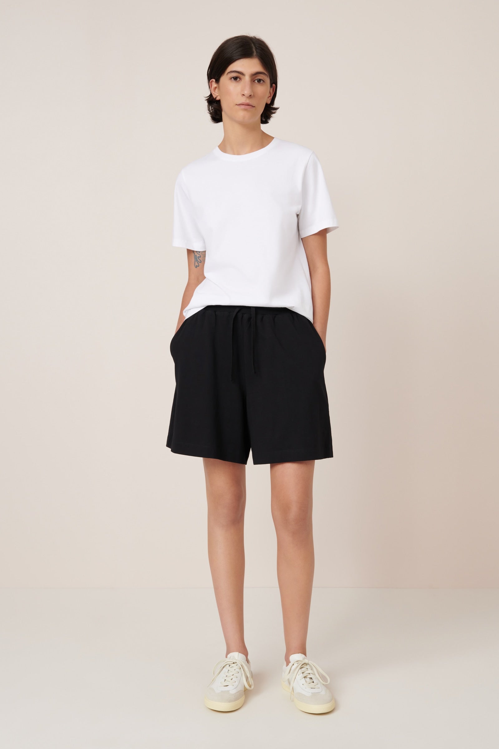 Ideal for casual wear, the Drawcord Shorts effortlessly combine comfort with versatility. These wide-leg shorts offer a relaxed fit that ends just above the knee. The mid-rise elastic waist includes a functional drawcord, while the back features two patch pockets and side seam pockets add to their practicality. Made from midweight organic cotton jersey.