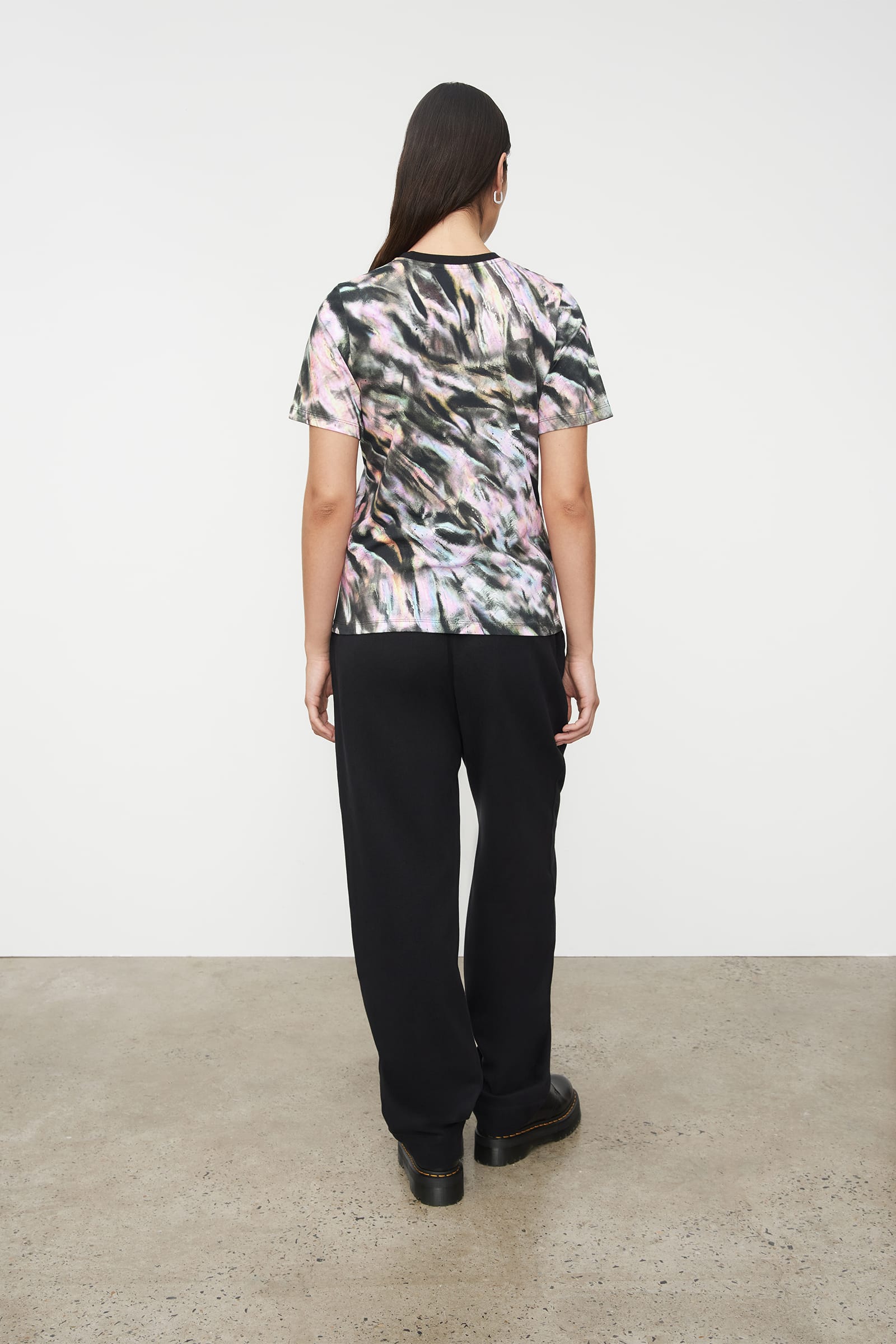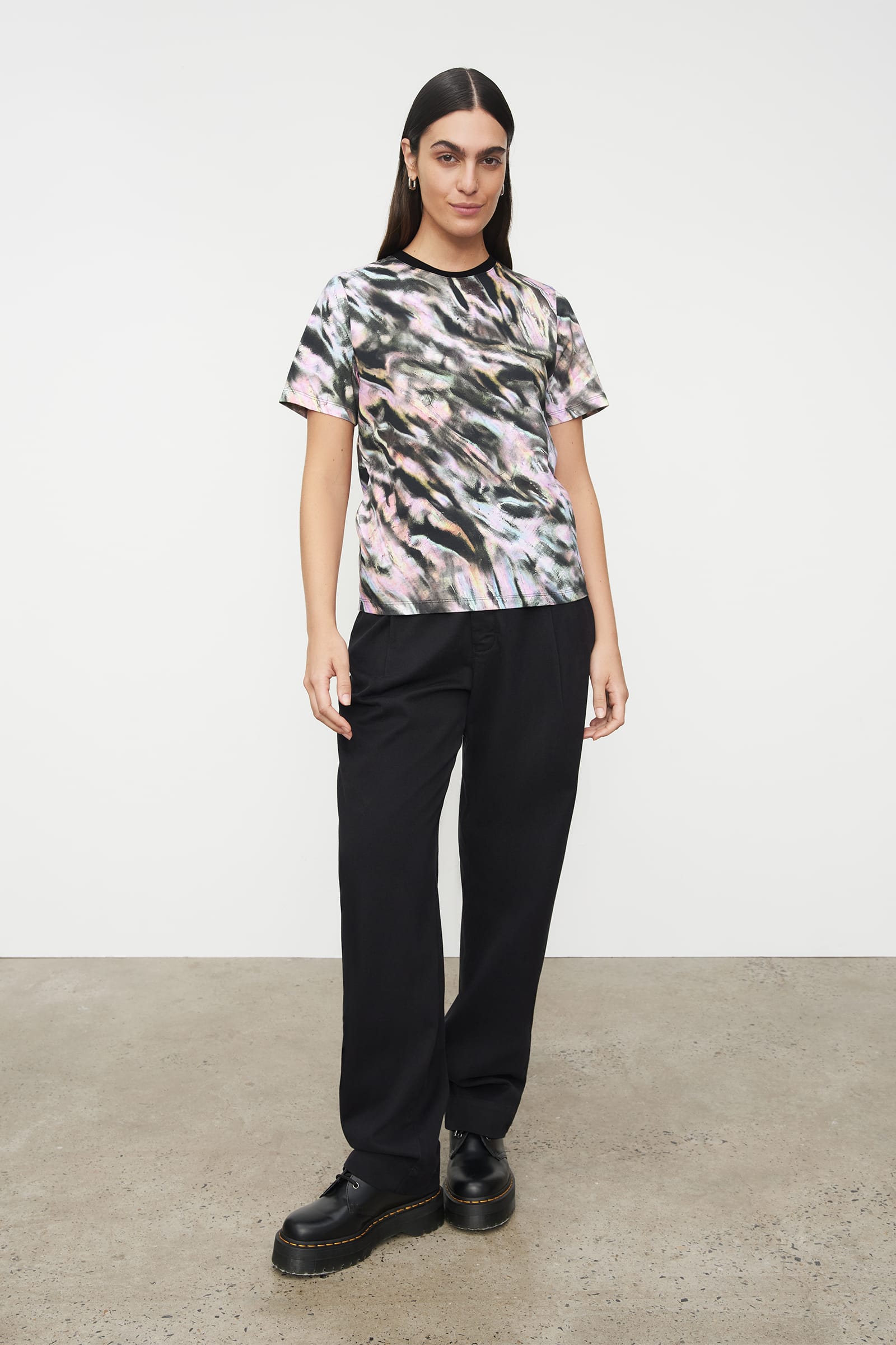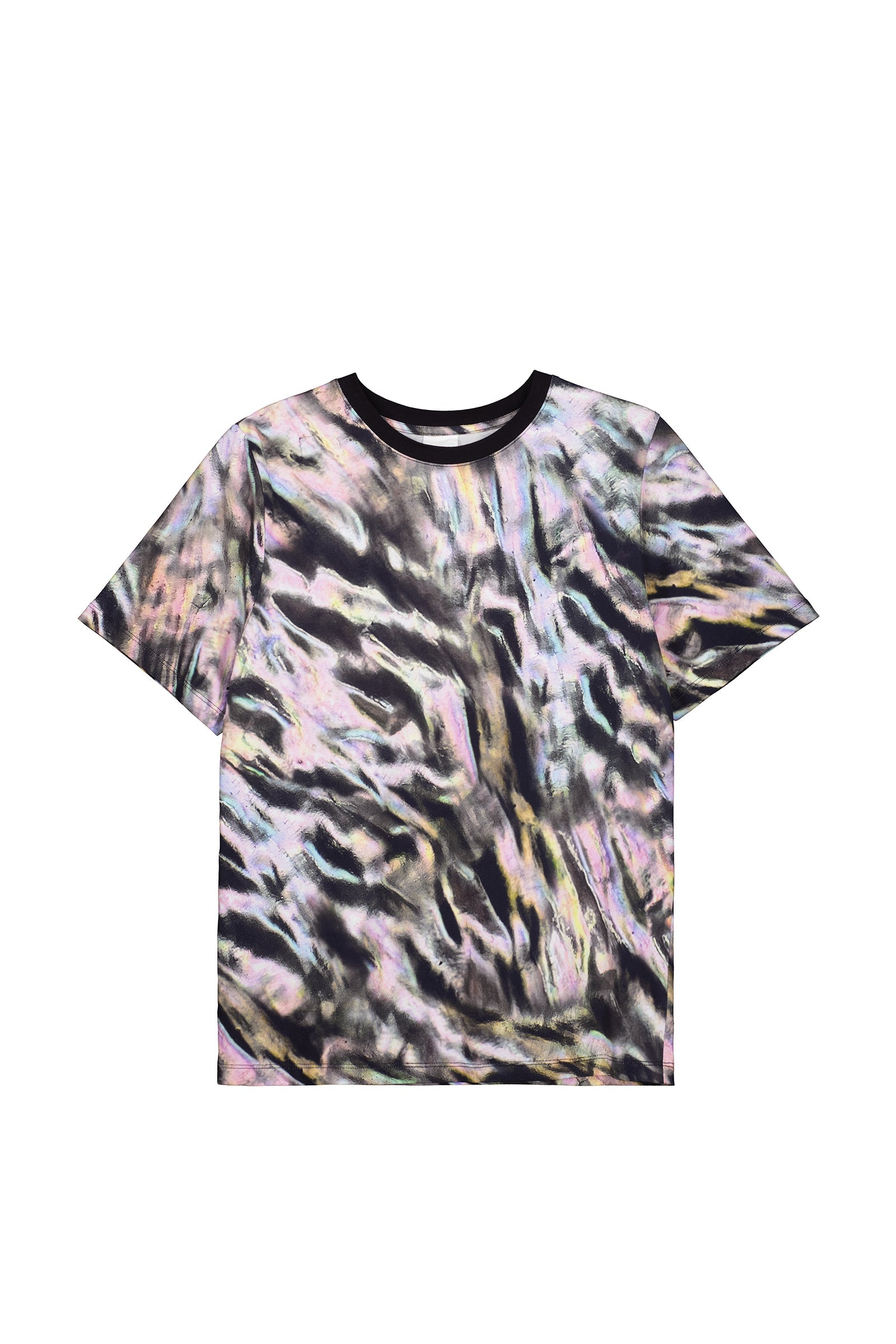 Our classic tee, made from 100% certified Fairtrade mid-weight organic cotton jersey digitally printed in our Iridescent print. Inspired by bioluminescence in our oceans and light shifting our perception of colour, the print is contrasted with a black neckband.