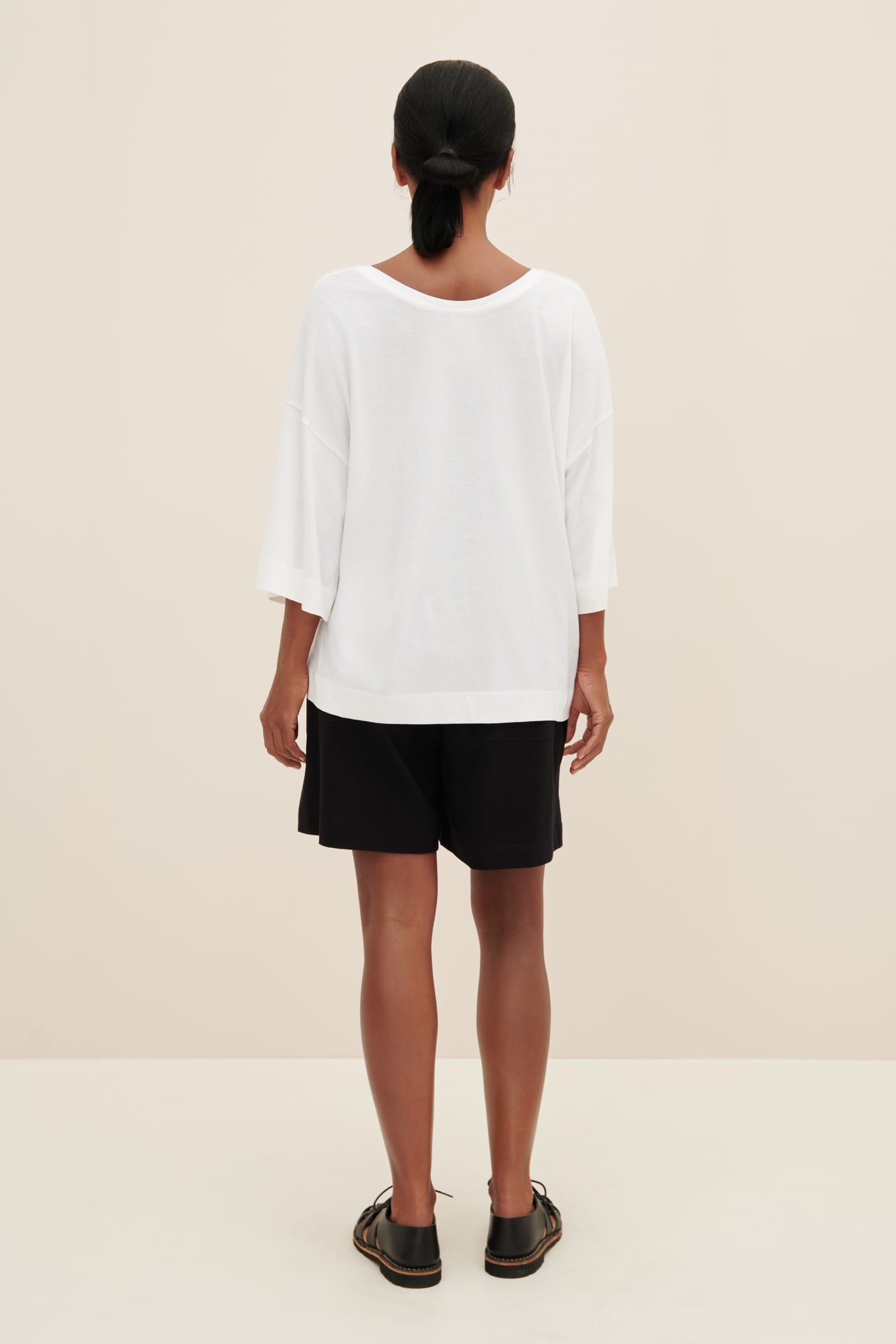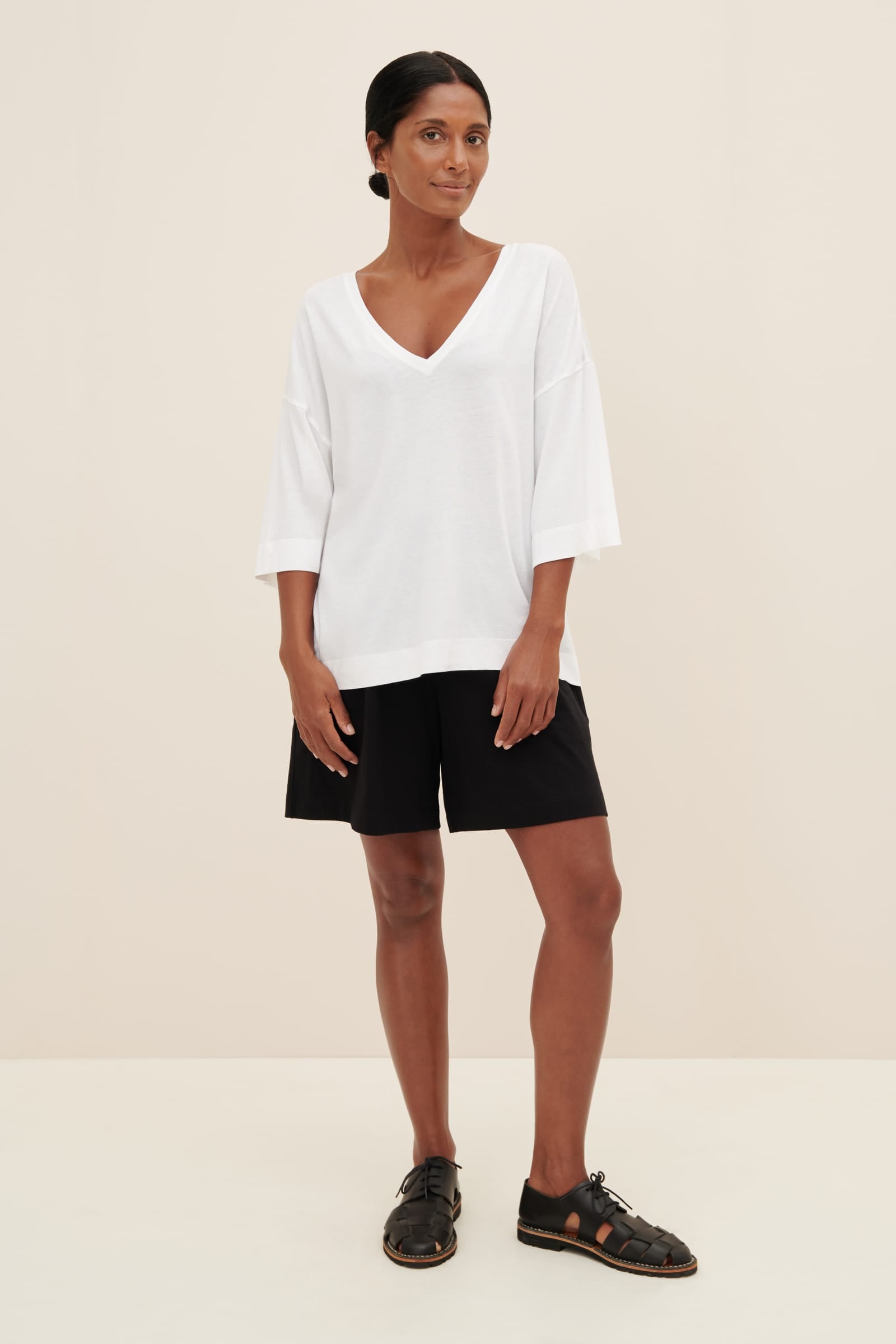 The Oversized V Neck Top has a relaxed fit and dropped shoulder silhouette. It features a wide V neckline and is detailed with a deep hem and our signature twisted side seam.