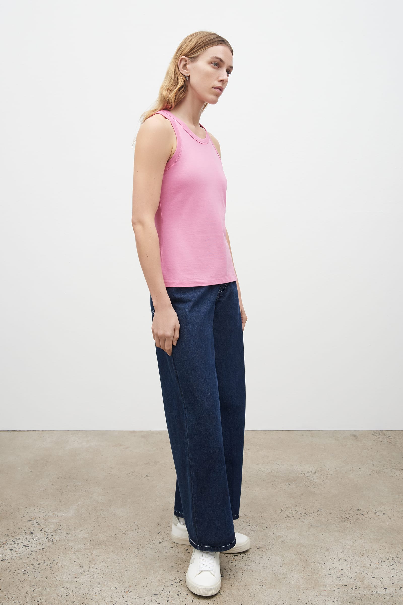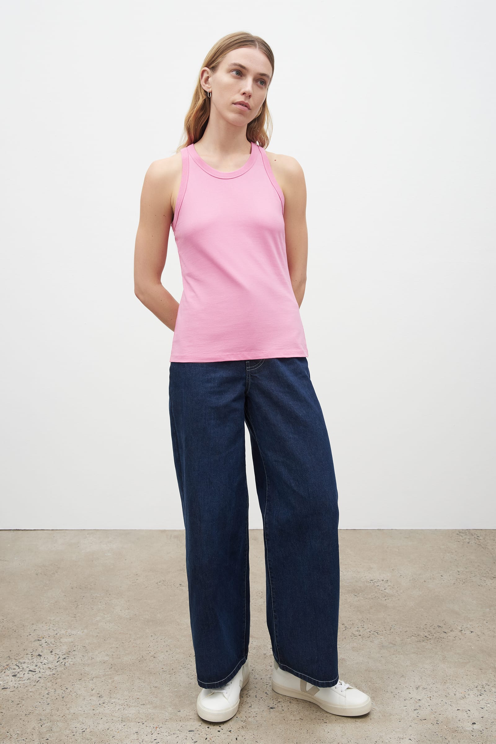 A fitted singlet with a racer back and ribbed binding around neck and armholes, made from 100% certified Fairtrade mid-weight organic cotton jersey.