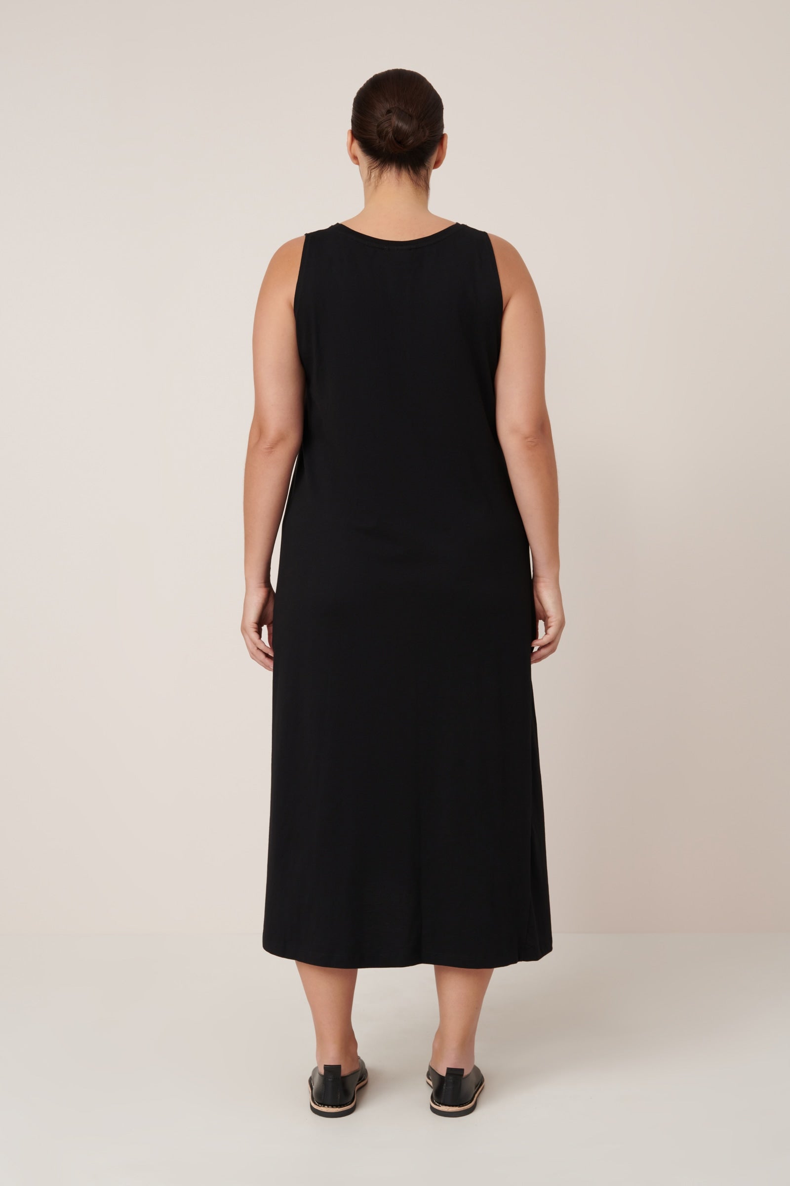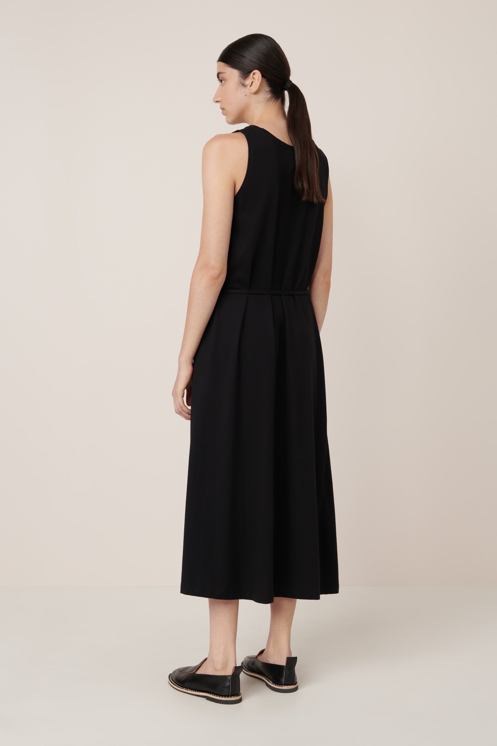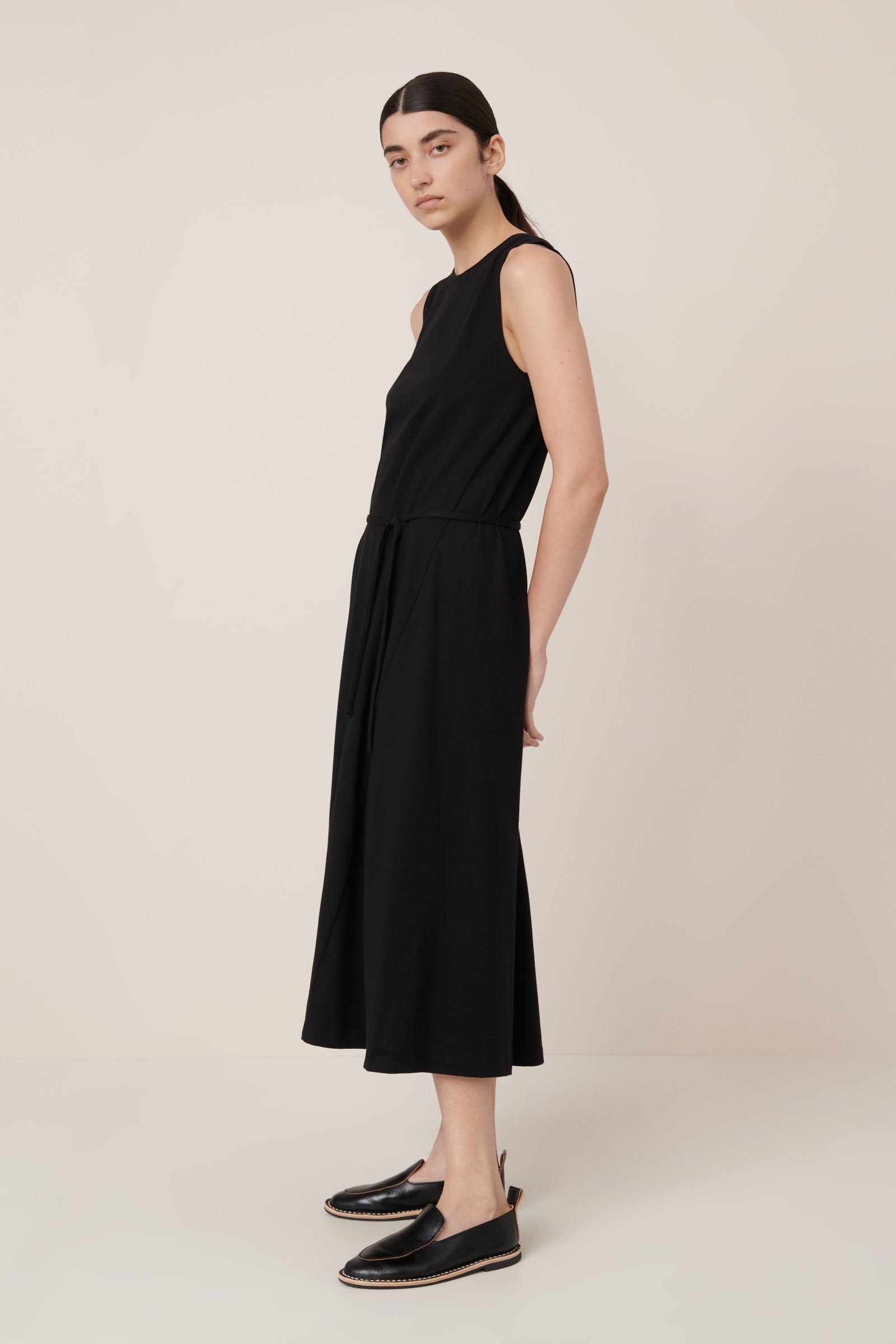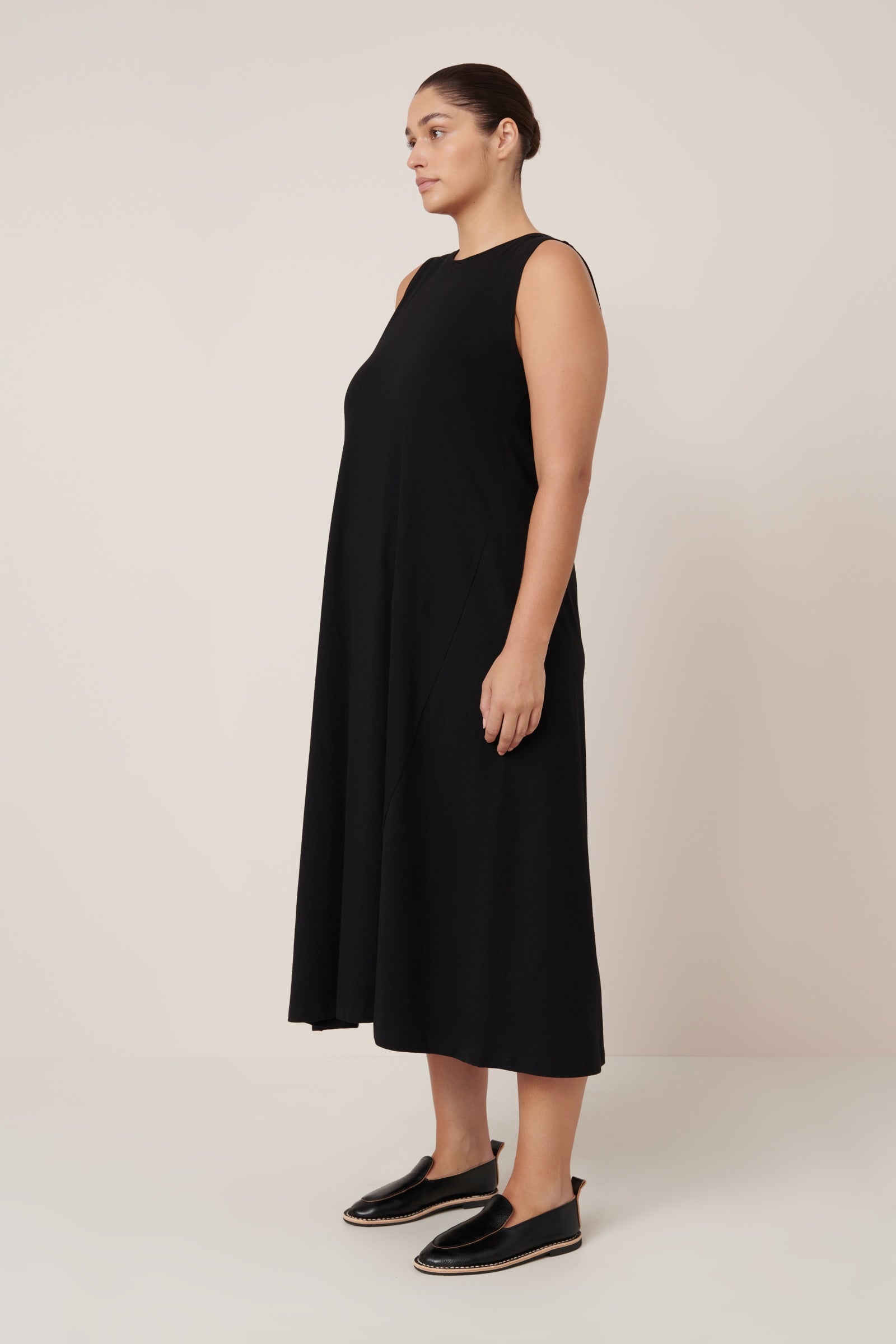 Our best selling Tank Swing Dress is an easy-wear style designed with an a-line shape for a relaxed, off the body fit. It falls to ankle length and features our signature twisted side seams. Made from midweight organic cotton jersey, it can be worn loose or cinched in at the waist with the narrow, self-fabric tie.