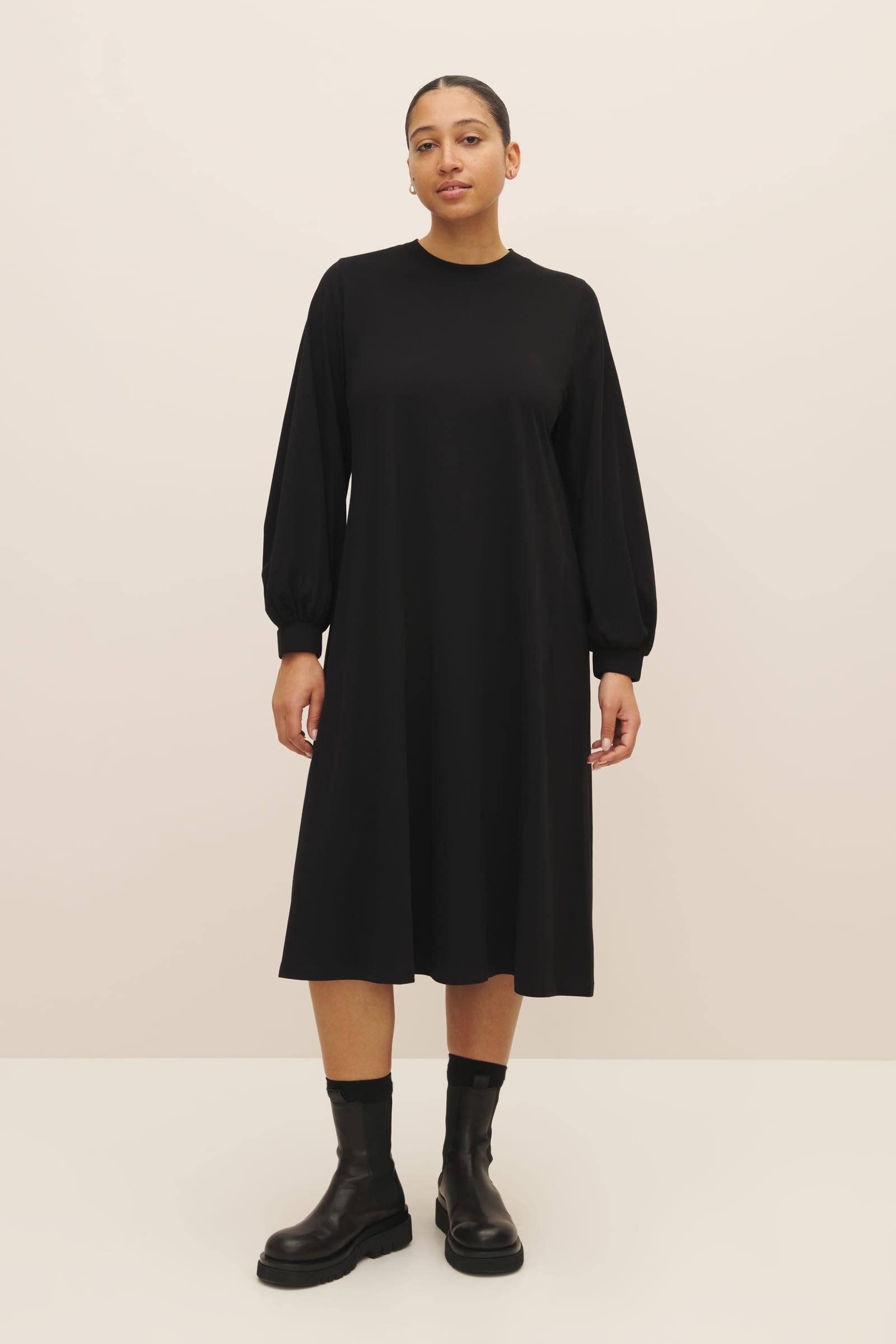 A full sleeve dress with a relaxed a-line shape, made from mid-weight organic cotton jersey. The dress is finished with a wide ribbed neckline and cuffs and features our signature twisted side seams.
