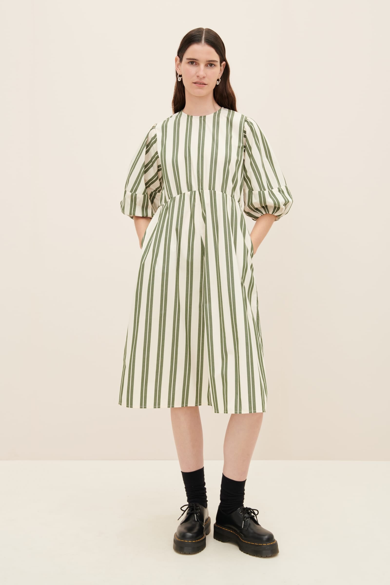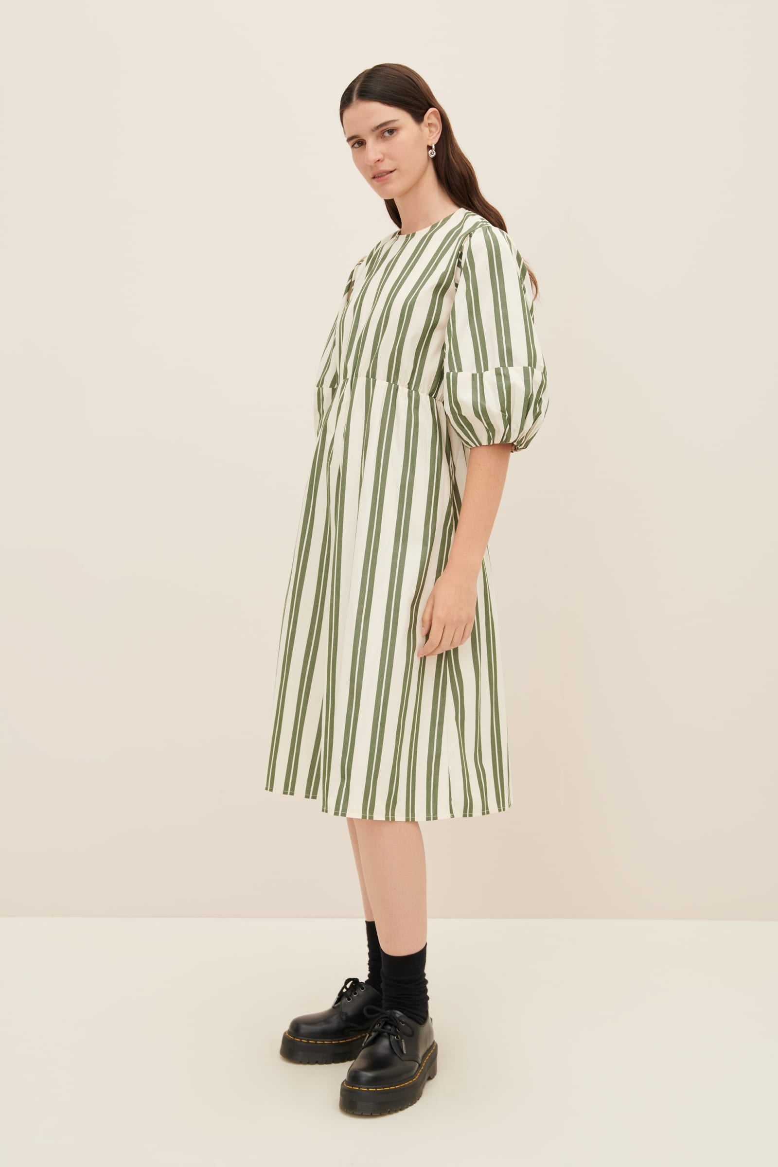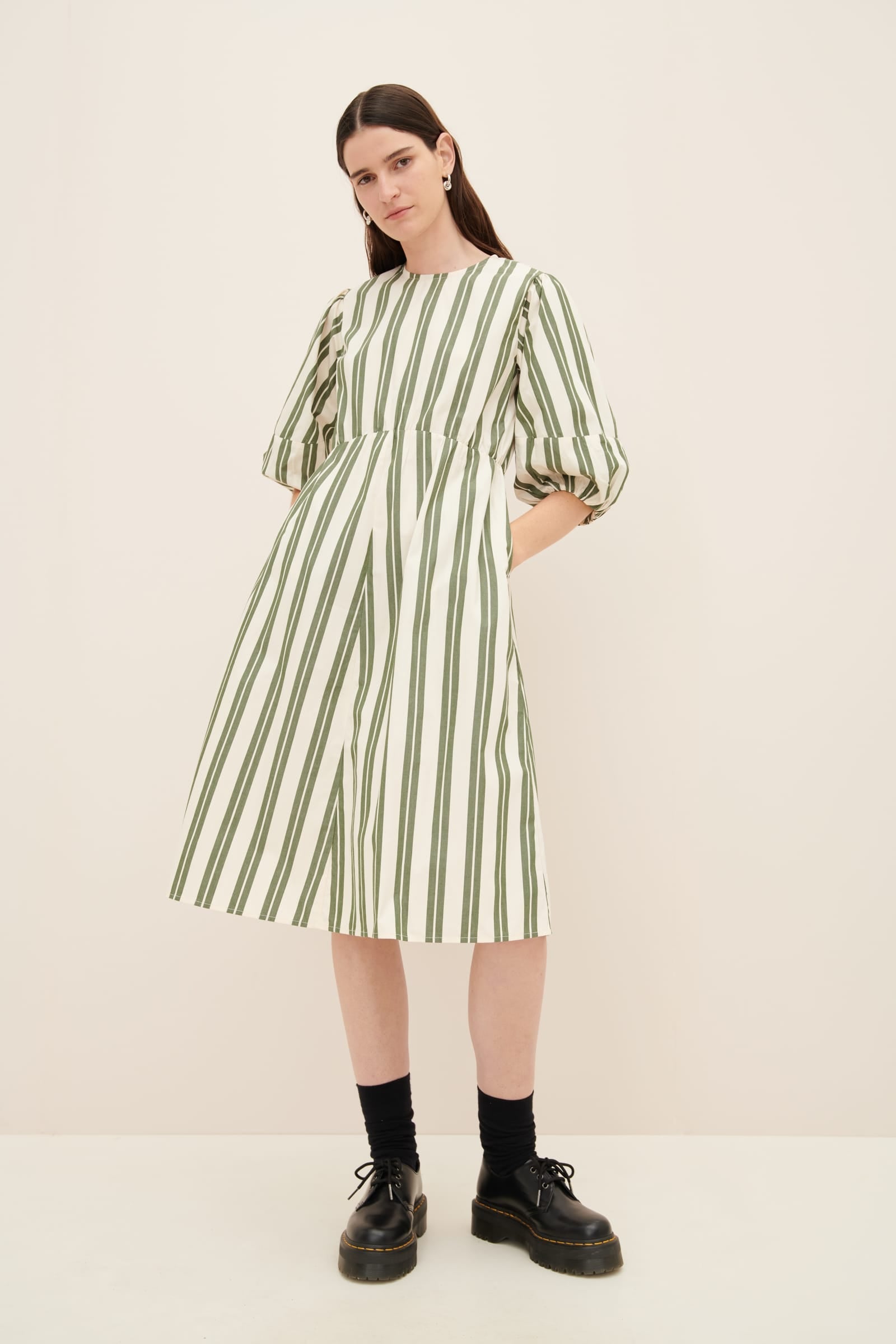 A simple yet sculptural dress, the Joan Dress has a standard fit with an elasticated waist and sculptural balloon sleeves. It falls to an effortless midi length and features an Agoya shell button closure at the back. Made from organic cotton poplin shirting in our Forest Stripe.