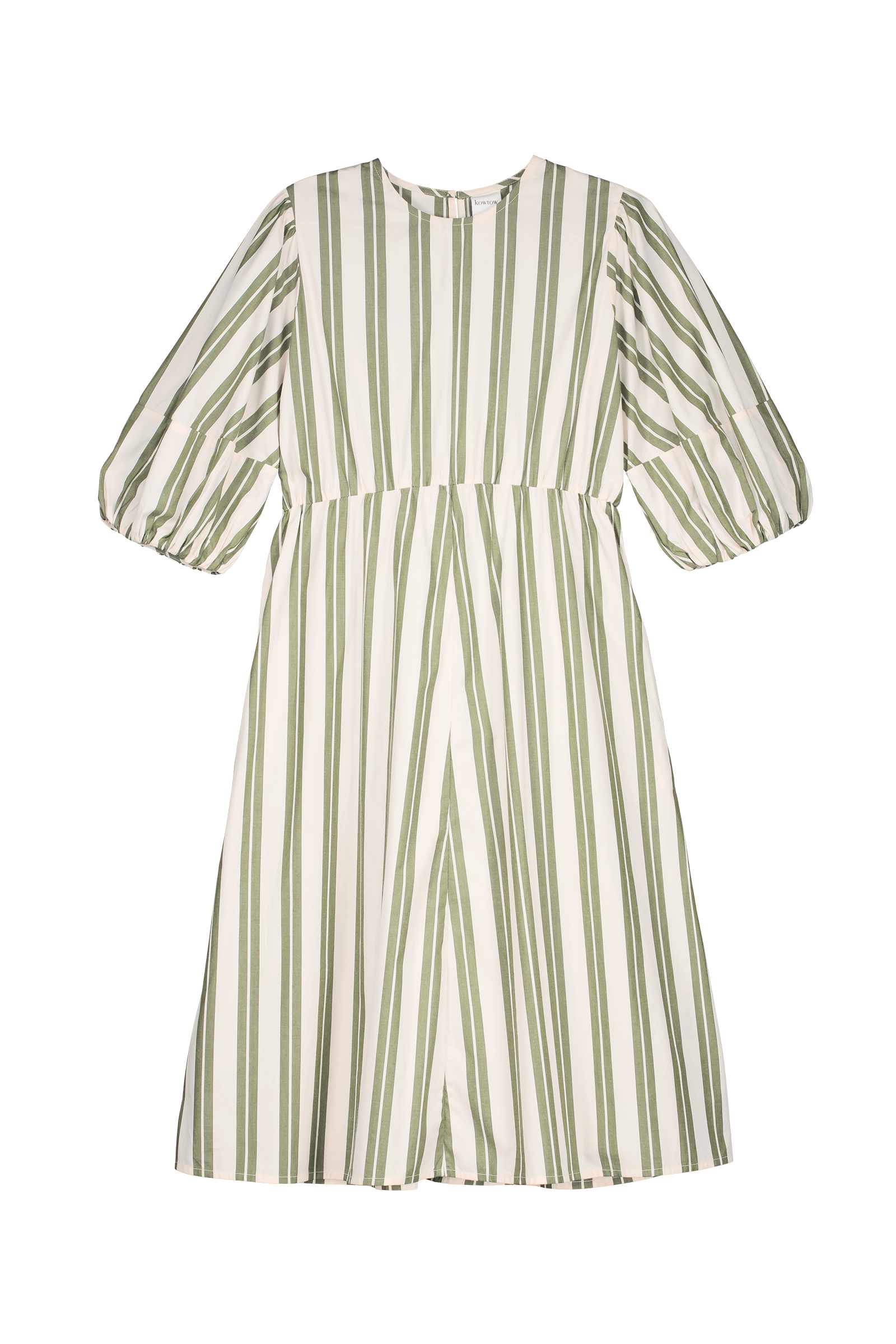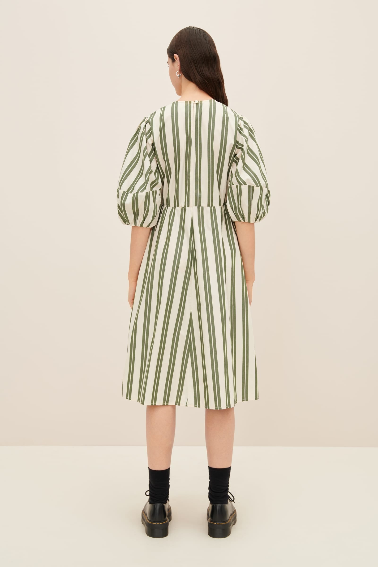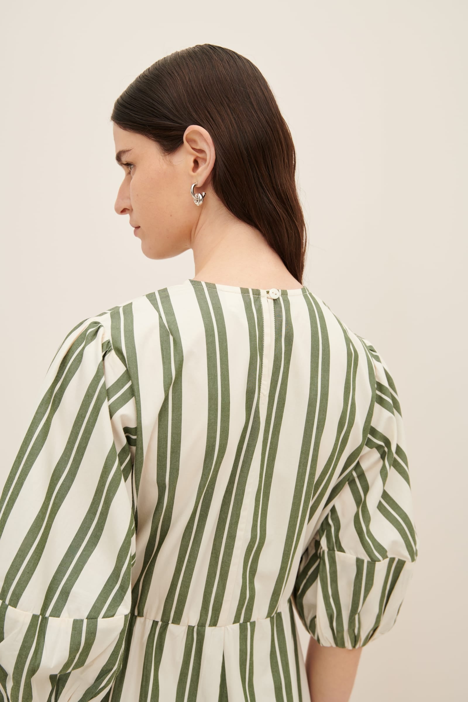 A simple yet sculptural dress, the Joan Dress has a standard fit with an elasticated waist and sculptural balloon sleeves. It falls to an effortless midi length and features an Agoya shell button closure at the back. Made from organic cotton poplin shirting in our Forest Stripe.