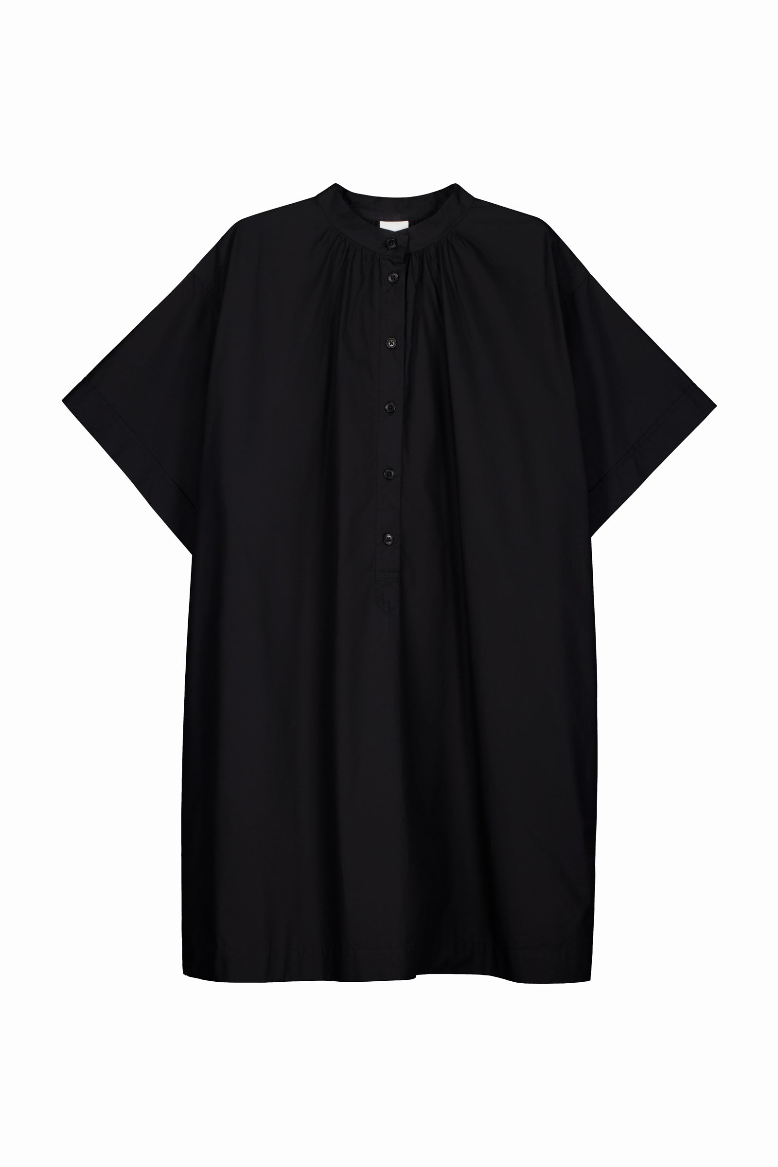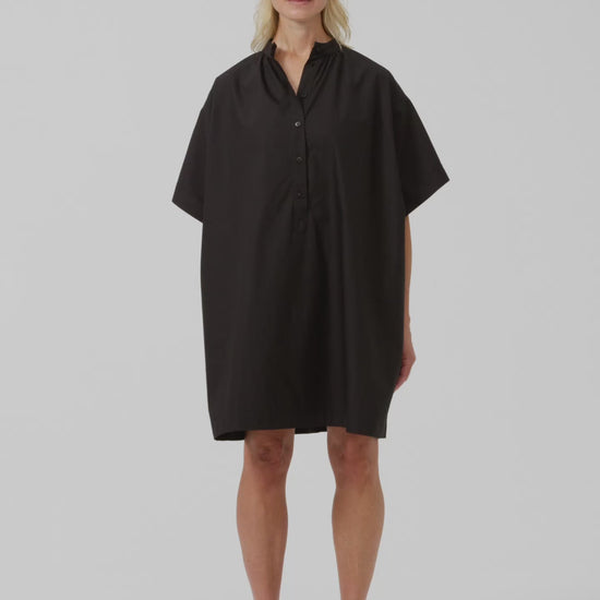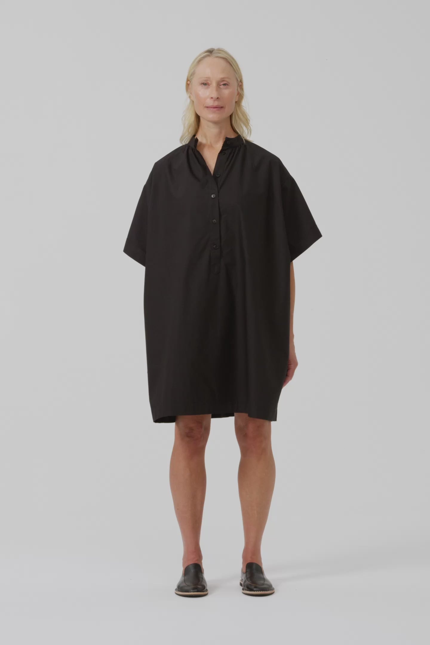 Crafted from a crisp organic cotton poplin, the Gallery Dress has an oversized fit with boxy, deep-cut sleeves, creating its bold silhouette. The softly gathered neckline is beautifully finished with a shell button placket. Ending just above the knee, the dress has inseam pockets for extra practicality.