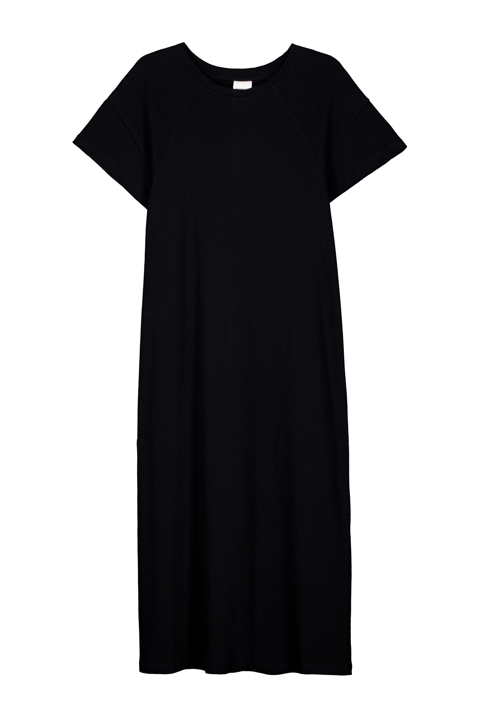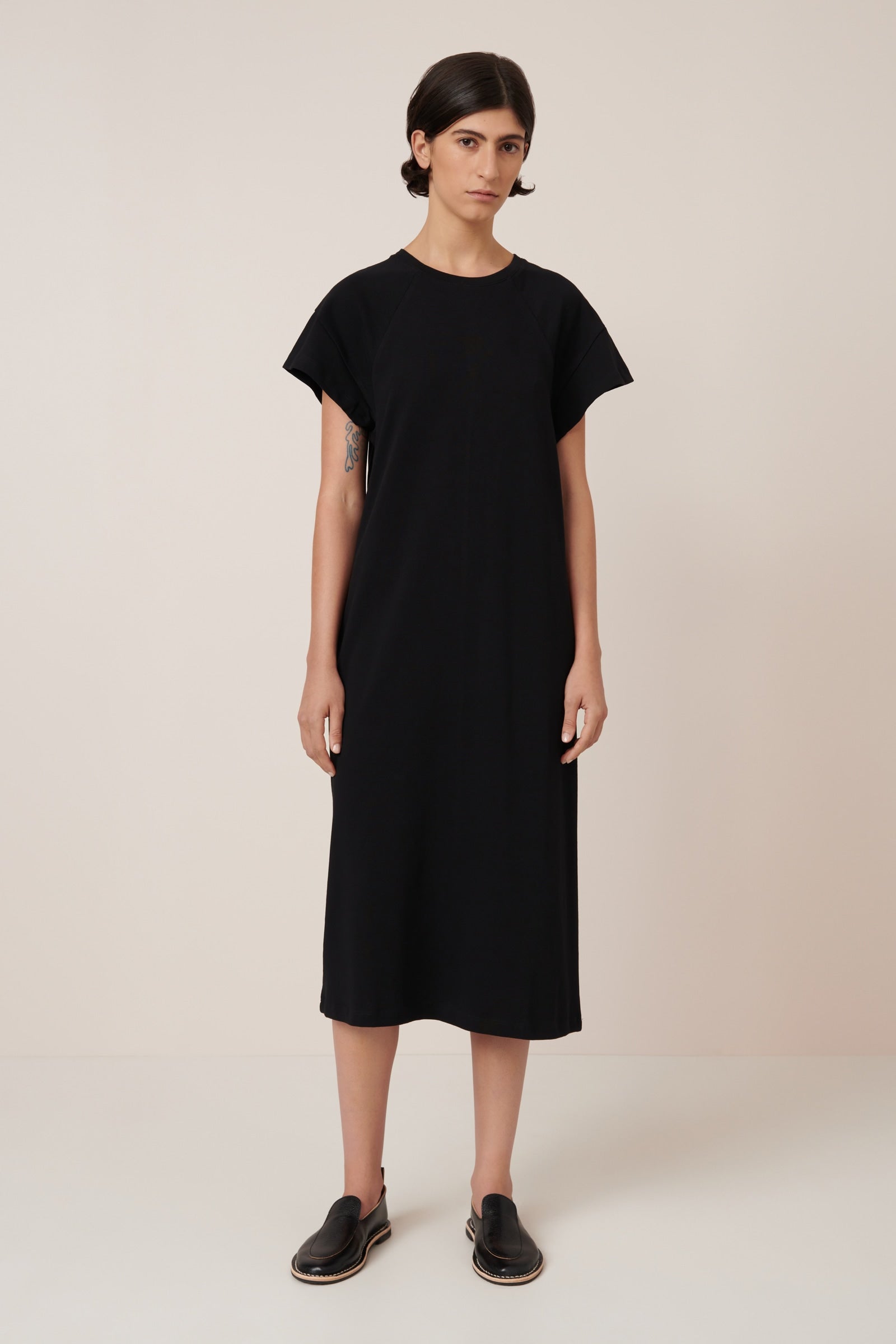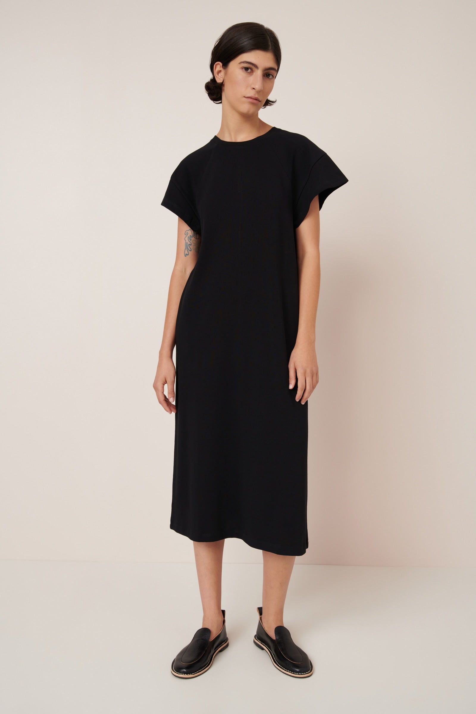 The Effect Dress features a relaxed silhouette with sculptural raglan sleeves and panel detailing throughout. Made from a heavy-weight organic cotton jersey, it falls to a flattering midi length with a standard fit.