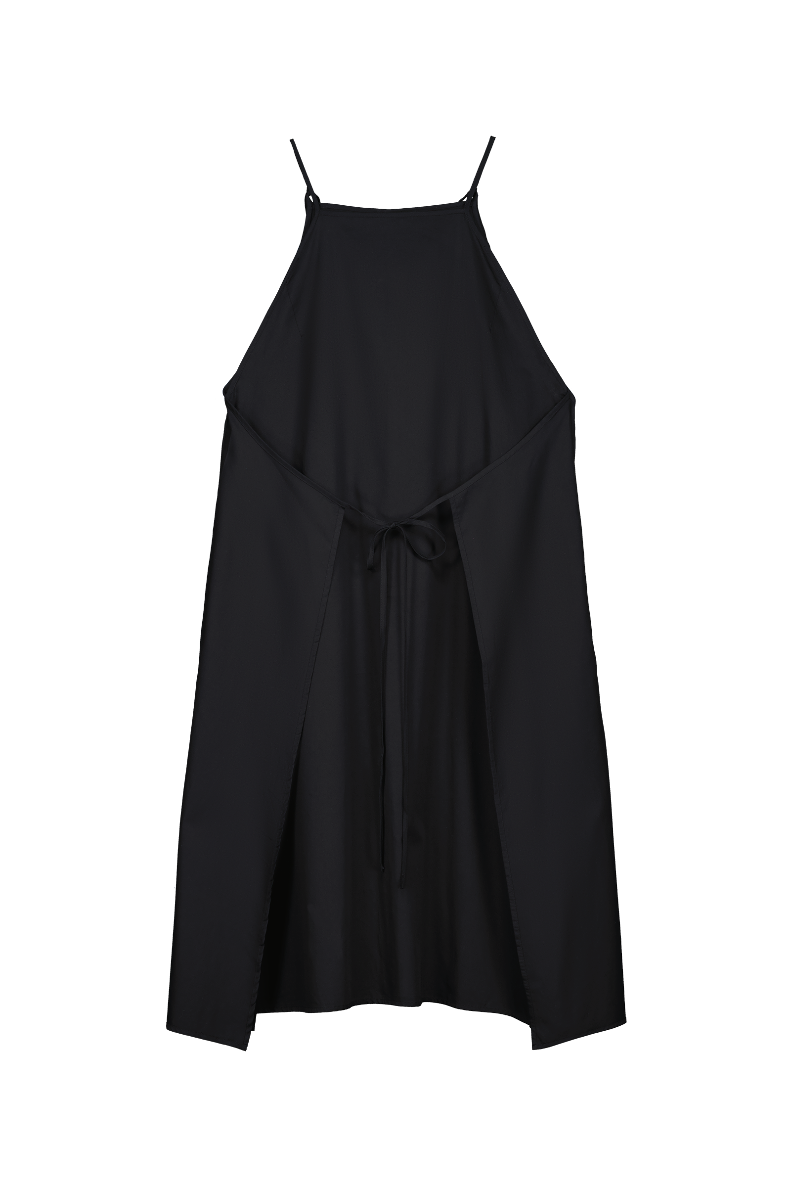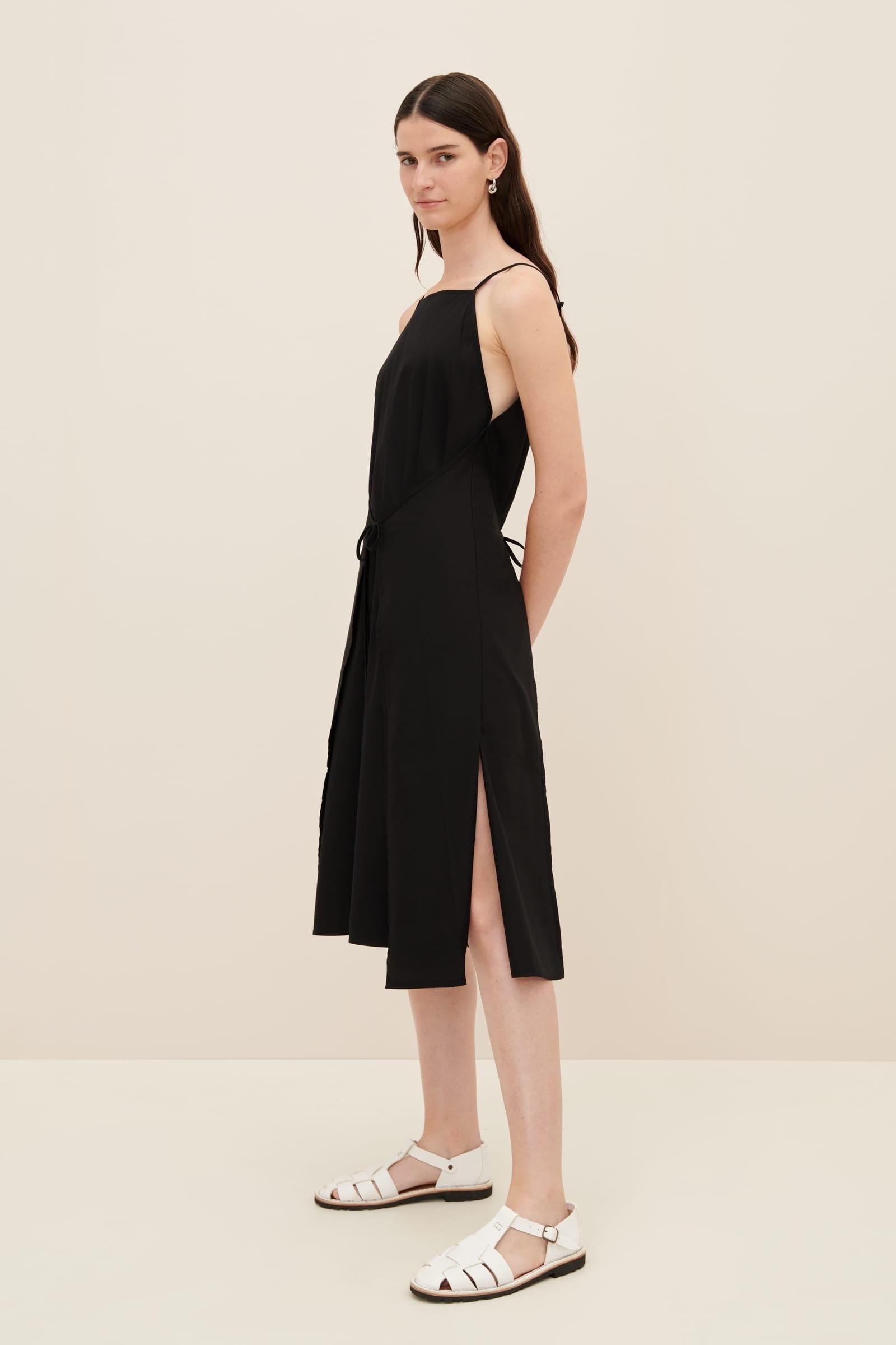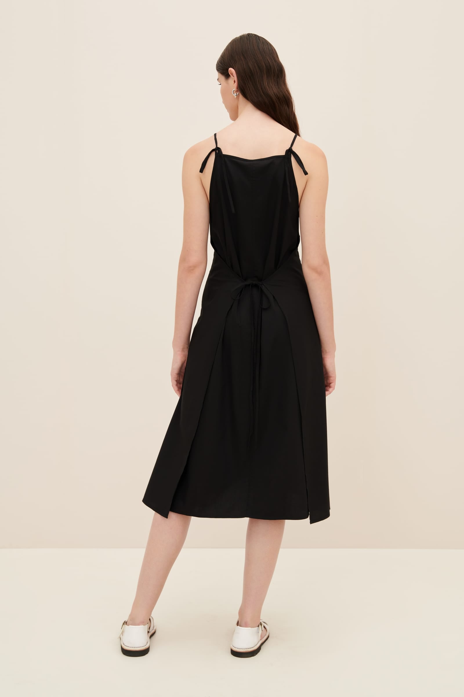 The Ingrid Apron Dress is inspired by a potter's apron, made from organic cotton twill. It has a standard fit and features delicate straps throughout. Front and back panels tie at the centre and cinch the waist while creating the dress's unique silhouette. Side splits ensure ease of movement. Falls to a below-the-knee length.