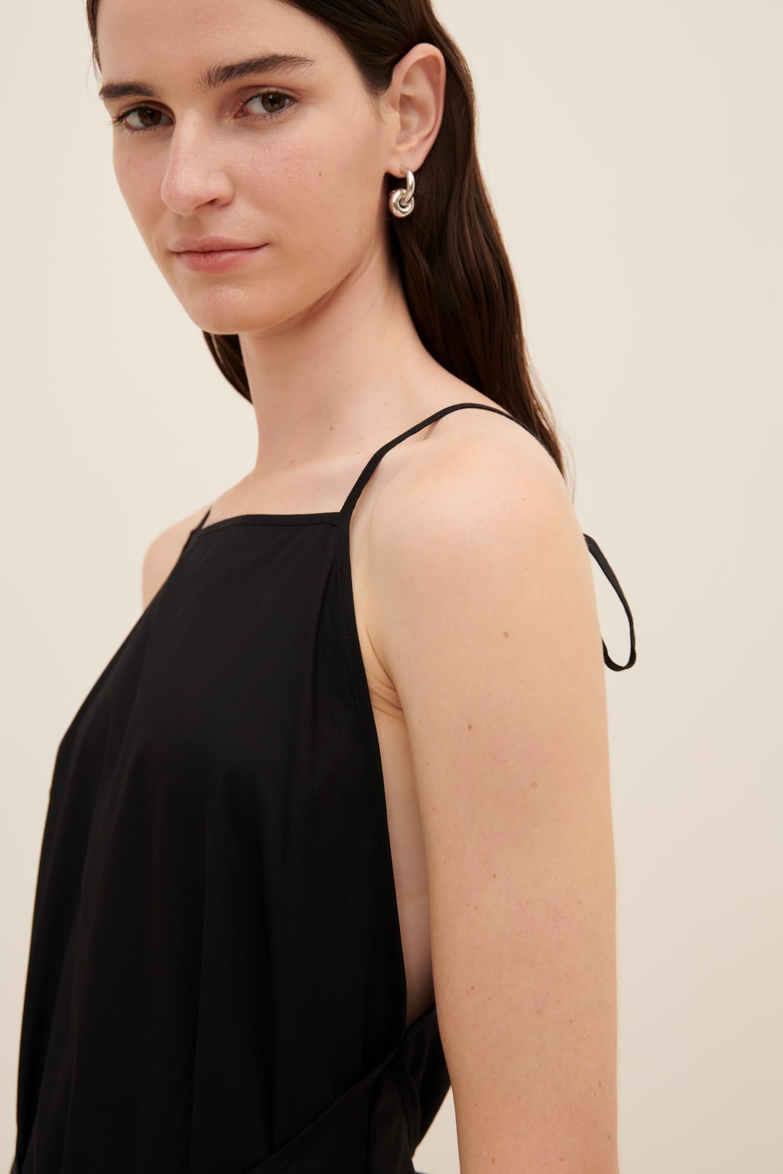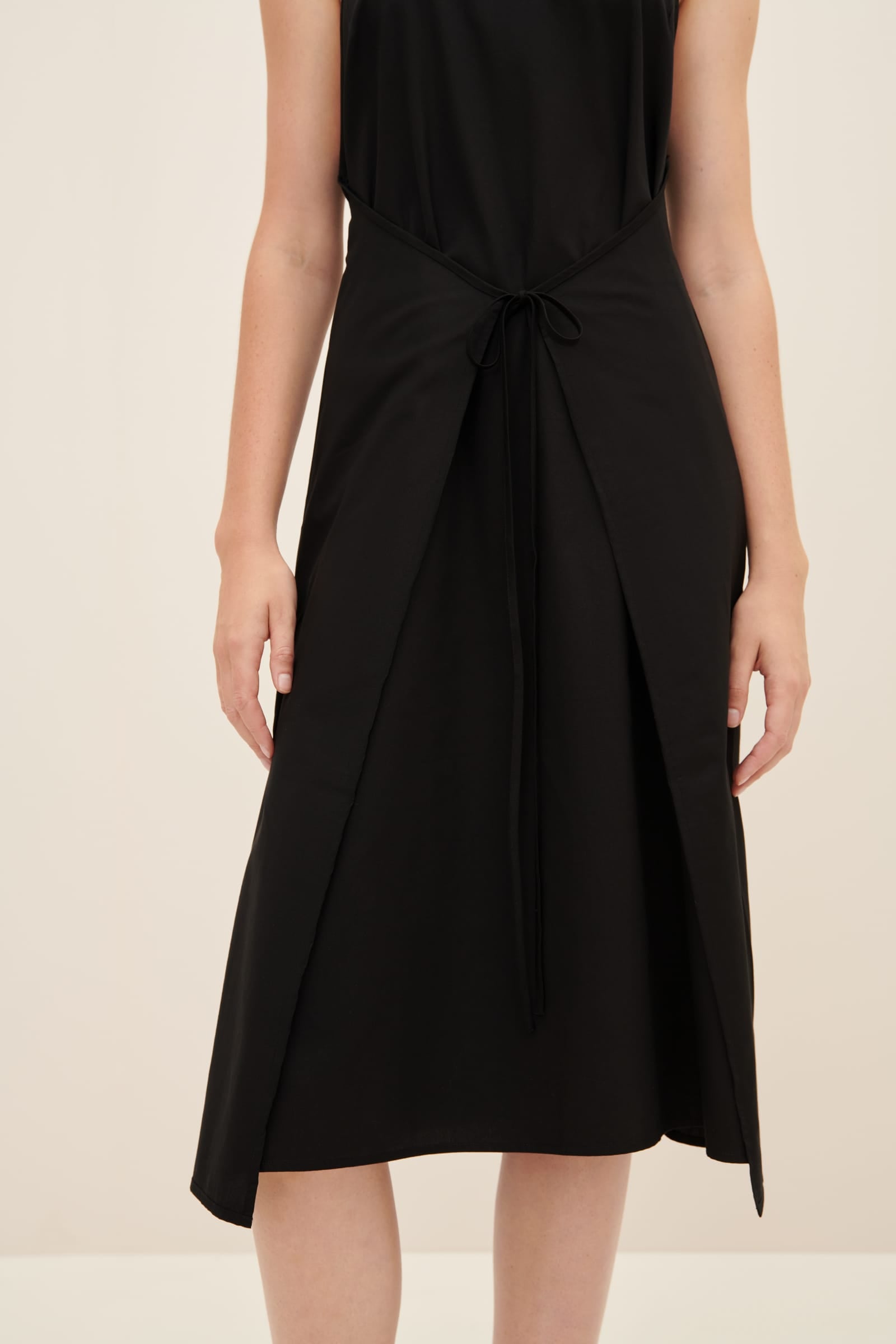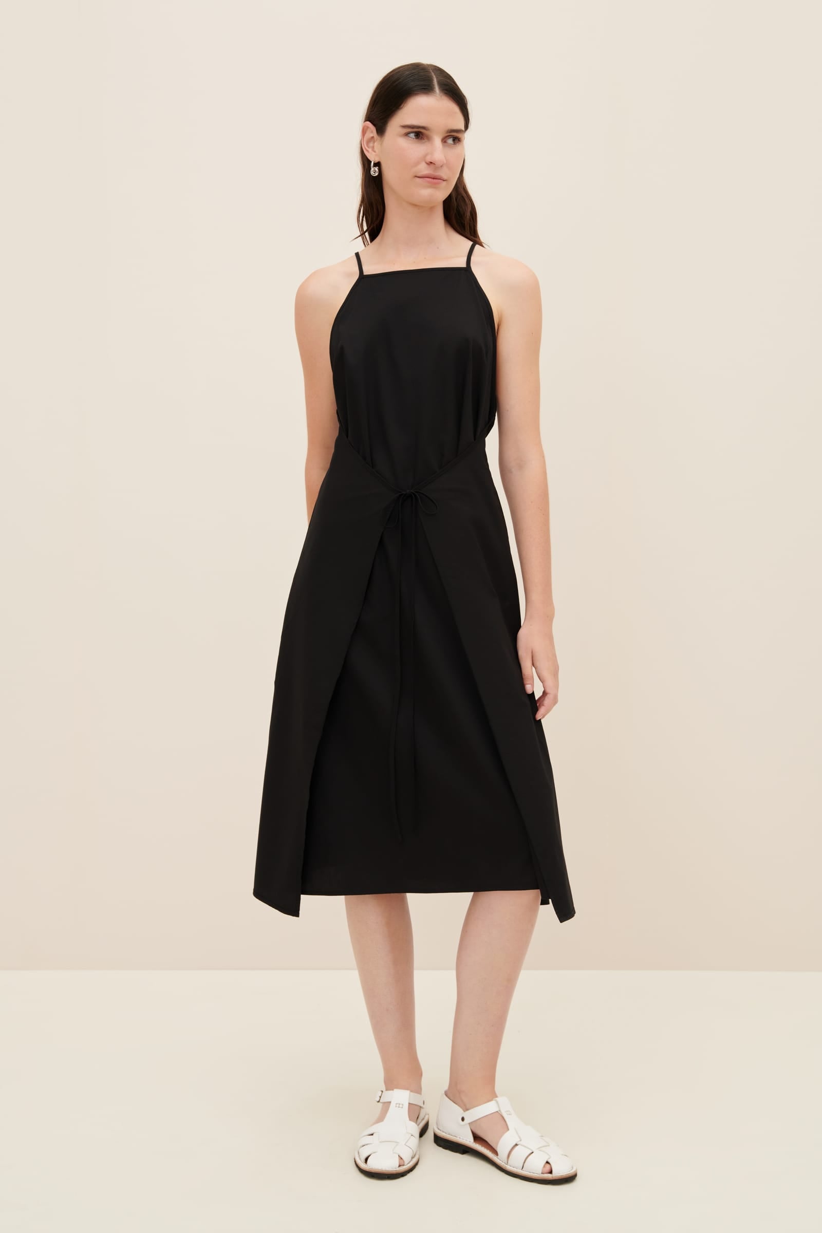 The Ingrid Apron Dress is inspired by a potter's apron, made from organic cotton twill. It has a standard fit and features delicate straps throughout. Front and back panels tie at the centre and cinch the waist while creating the dress's unique silhouette. Side splits ensure ease of movement. Falls to a below-the-knee length.