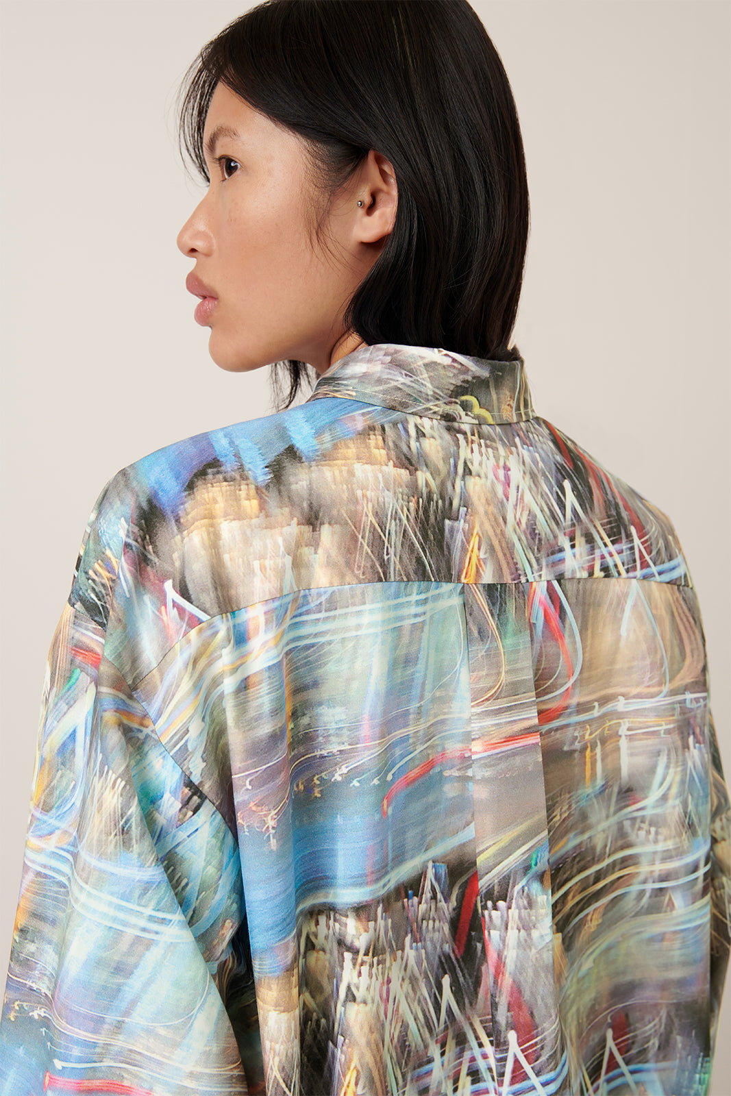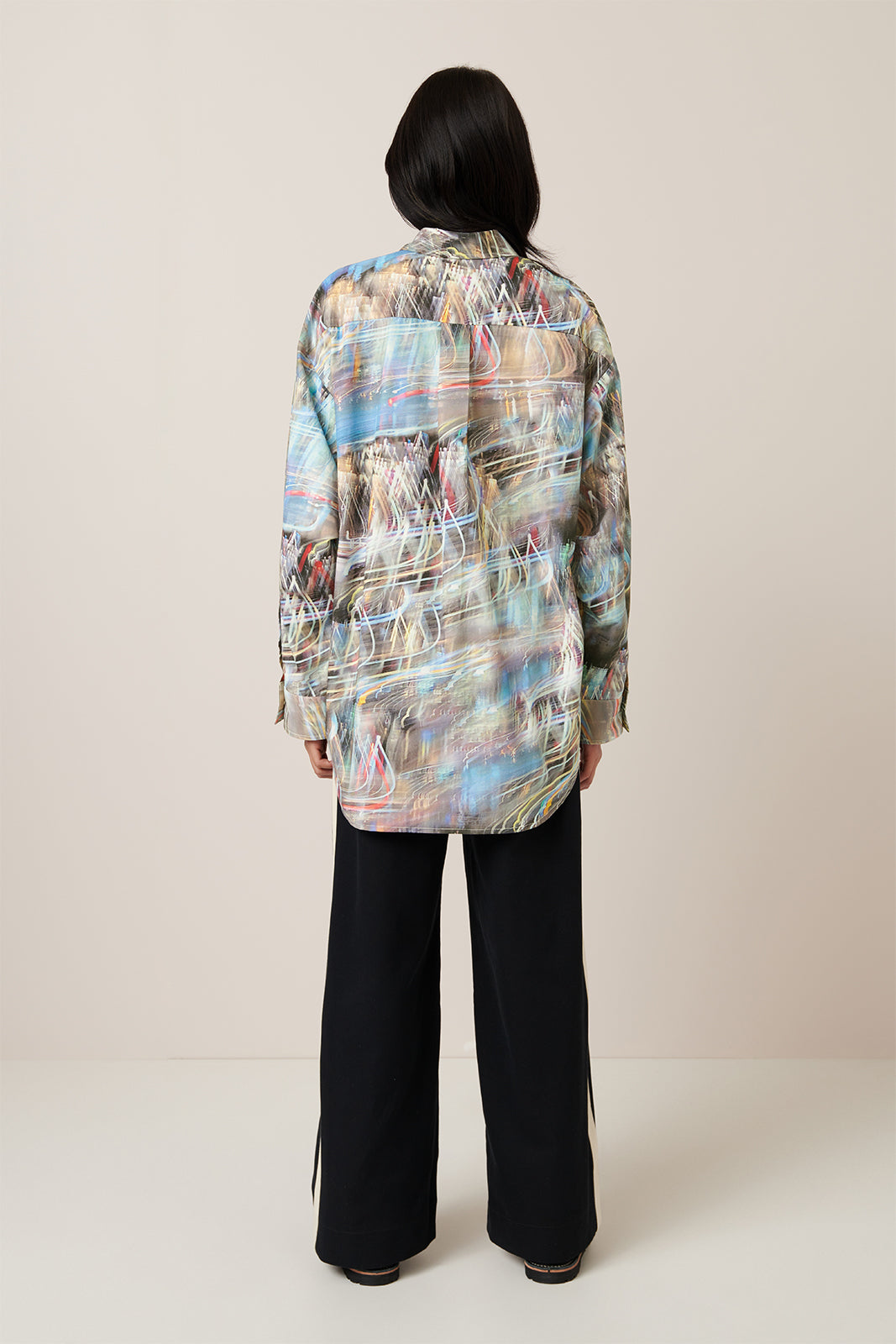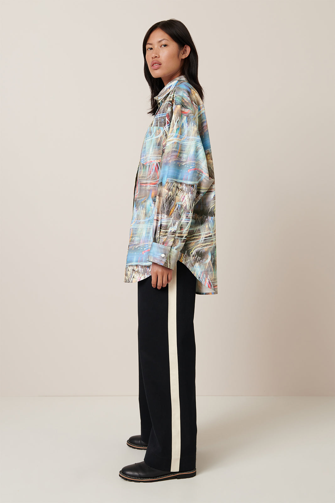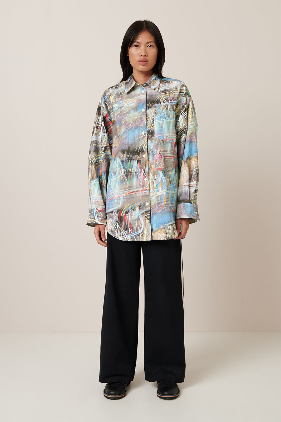 An oversized fit, men's style shirt with a drop shoulder and exaggerated batwing sleeve. The Nova Shirt has a classic shirt collar, wide cuffs and an Agoya shell button closure through the front. Made from organic cotton poplin that is digitally printed in our Cityscape print, capturing the city's energy at night.