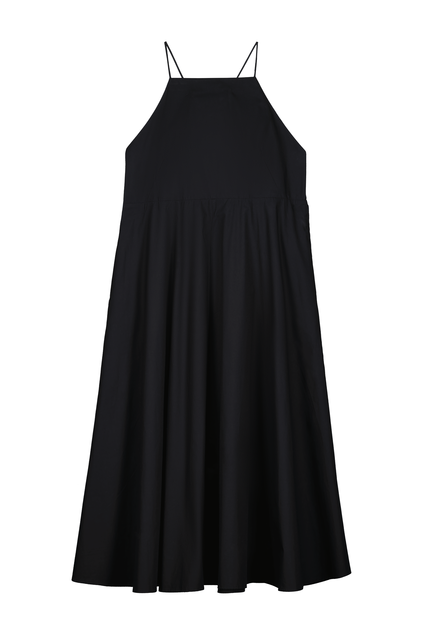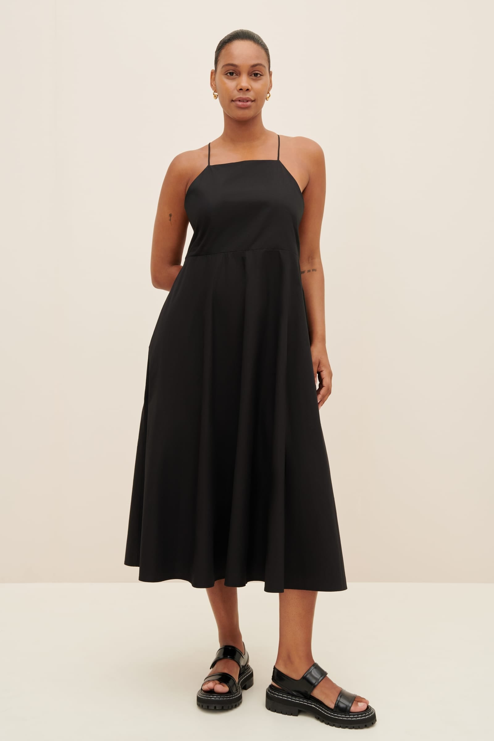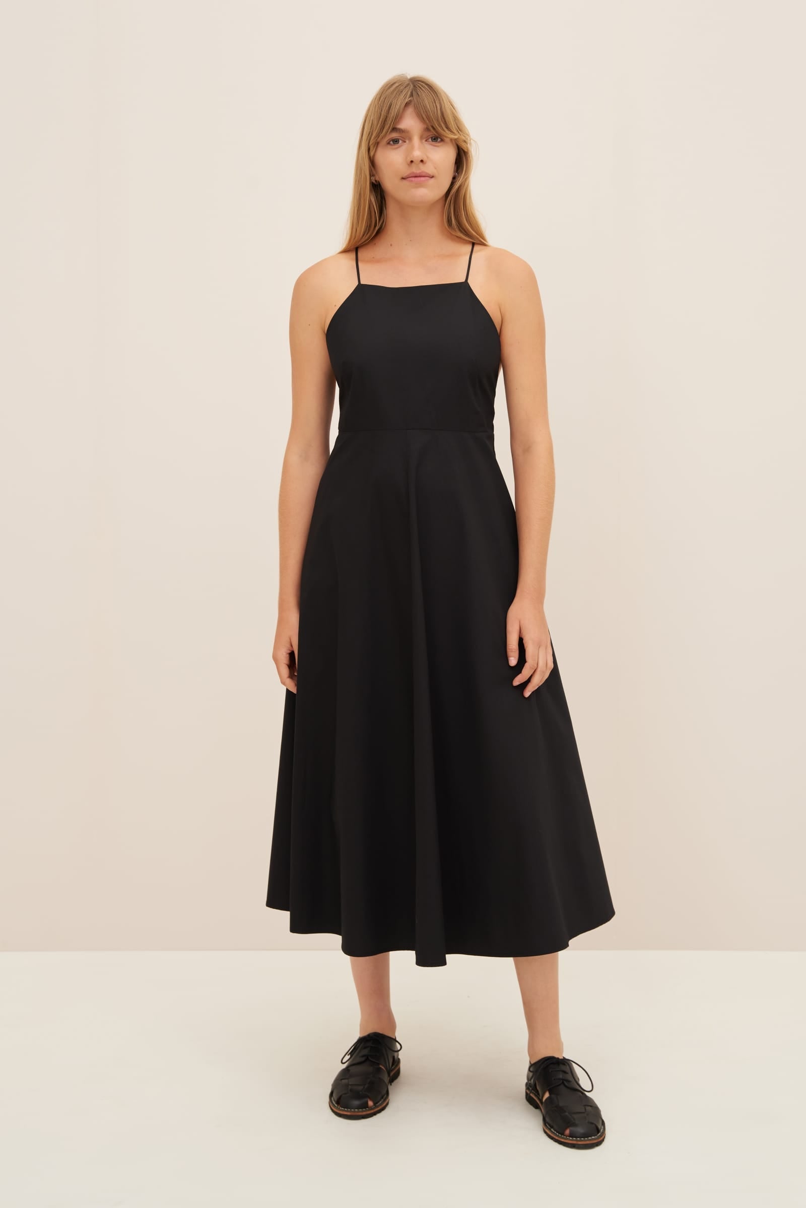 The Axis Dress is inspired by a potter's apron and defined by delicate straps that crossover and tie at the back. Made from organic cotton poplin shirting, it has a standard fit with a fitted bodice and flared midi-length skirt which gently gathers at the lower back. Style with a tee or tank underneath for a more casual look.