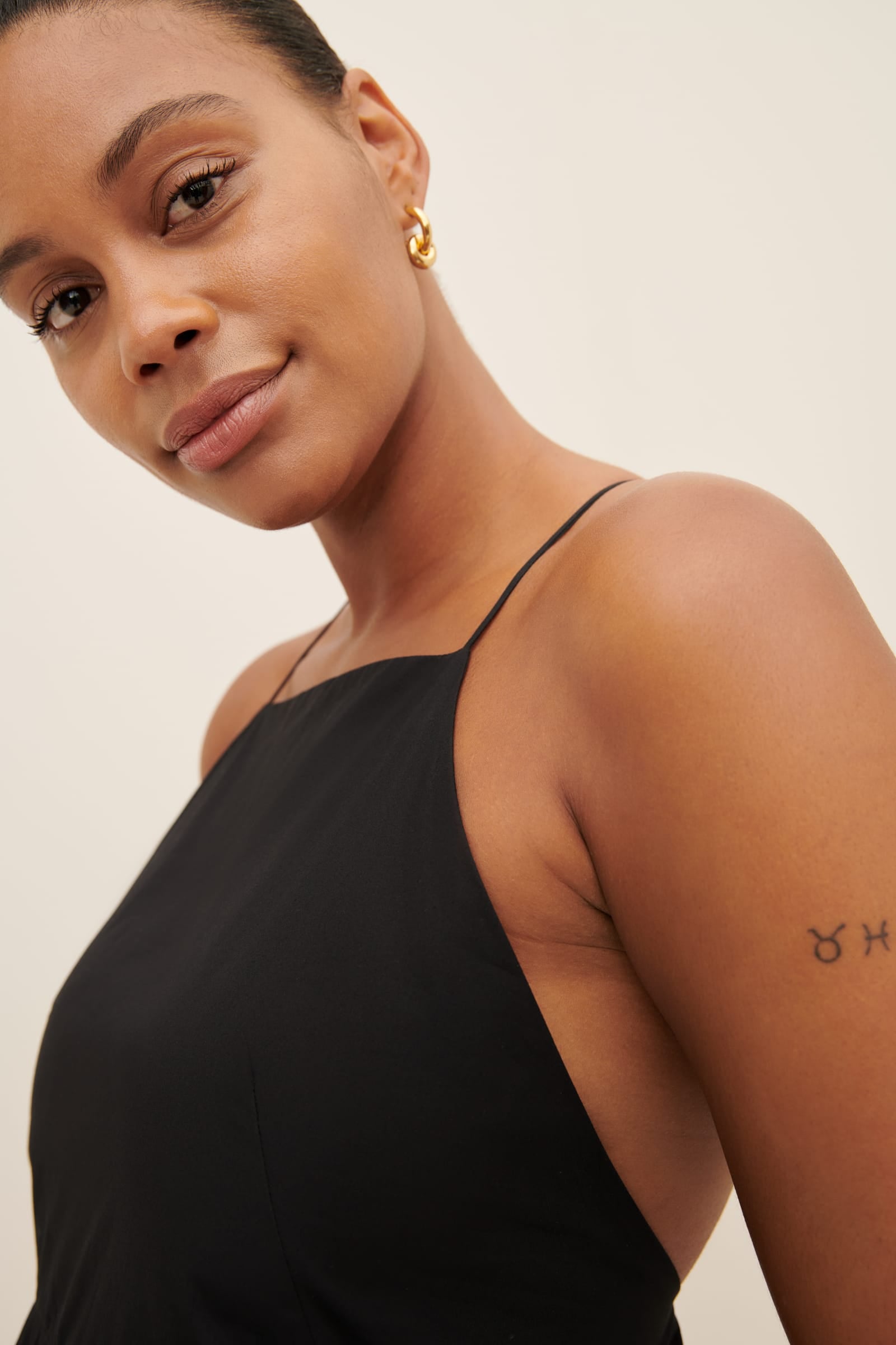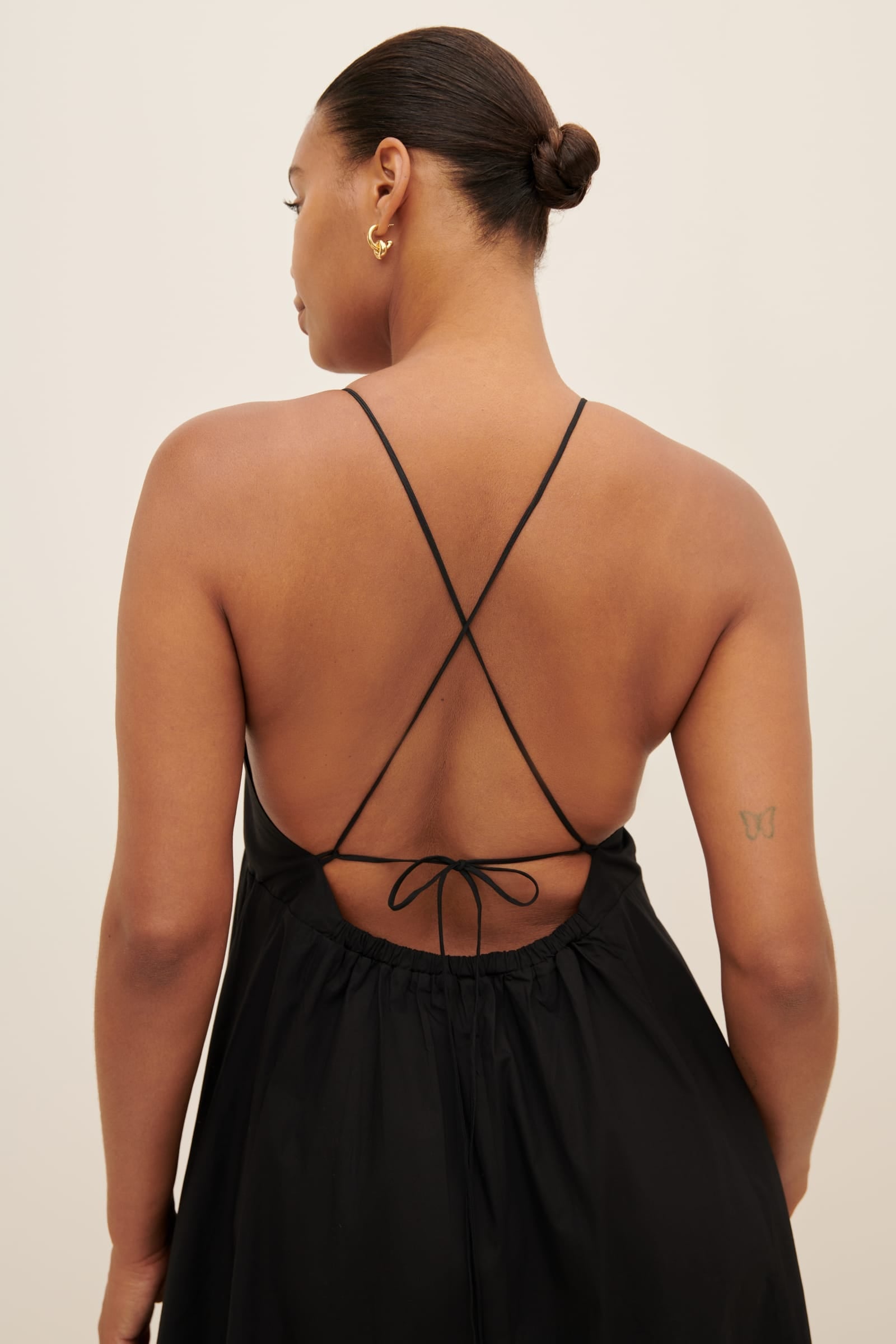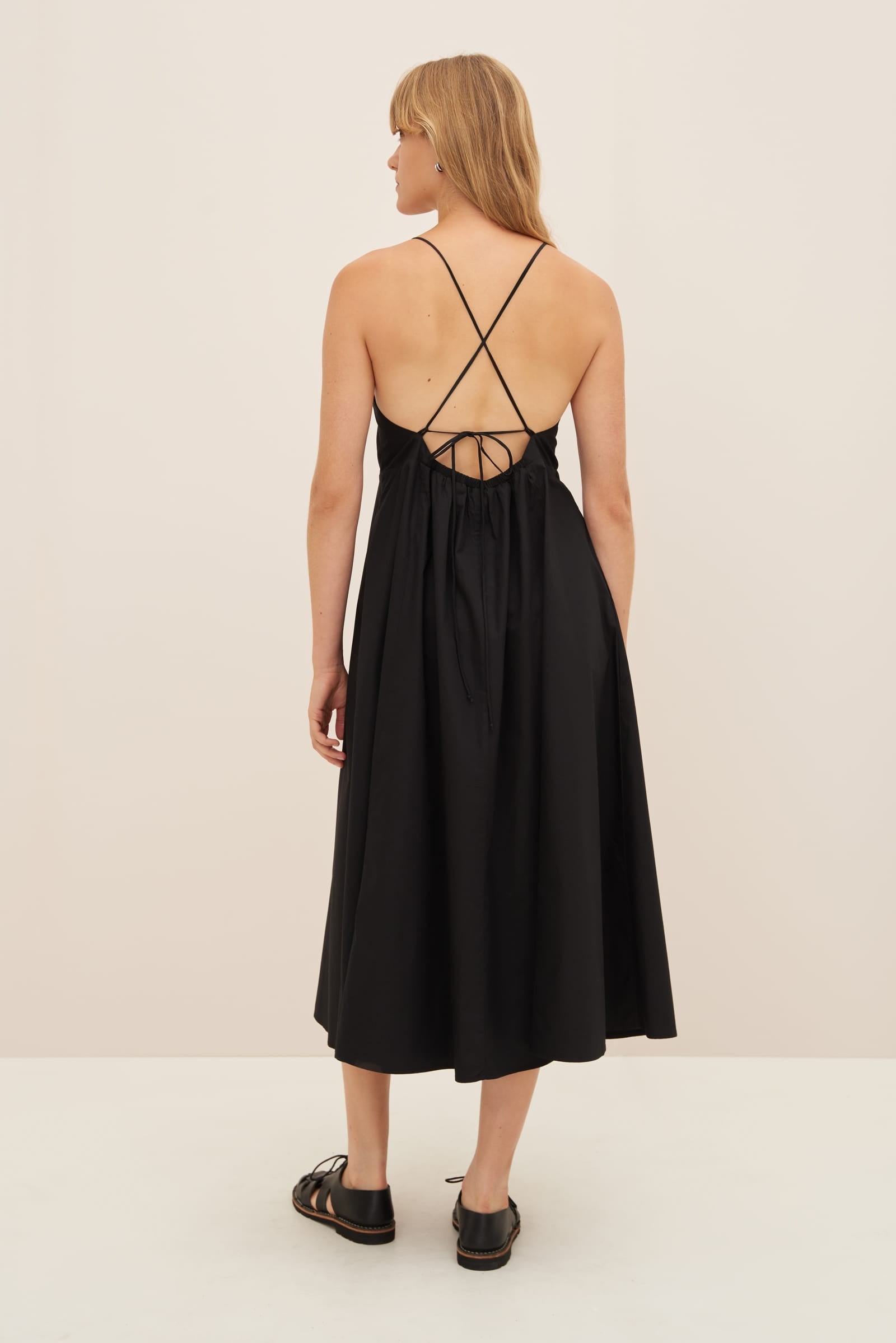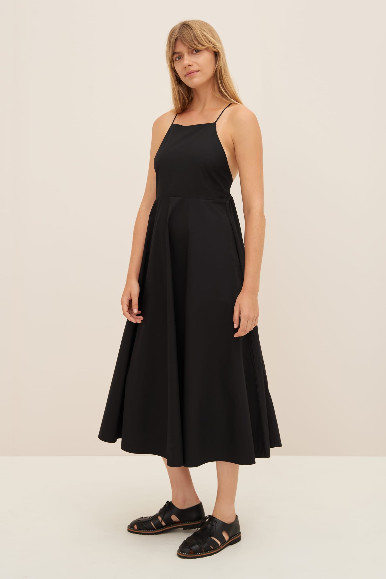 The Axis Dress is inspired by a potter's apron and defined by delicate straps that crossover and tie at the back. Made from organic cotton poplin shirting, it has a standard fit with a fitted bodice and flared midi-length skirt which gently gathers at the lower back. Style with a tee or tank underneath for a more casual look.