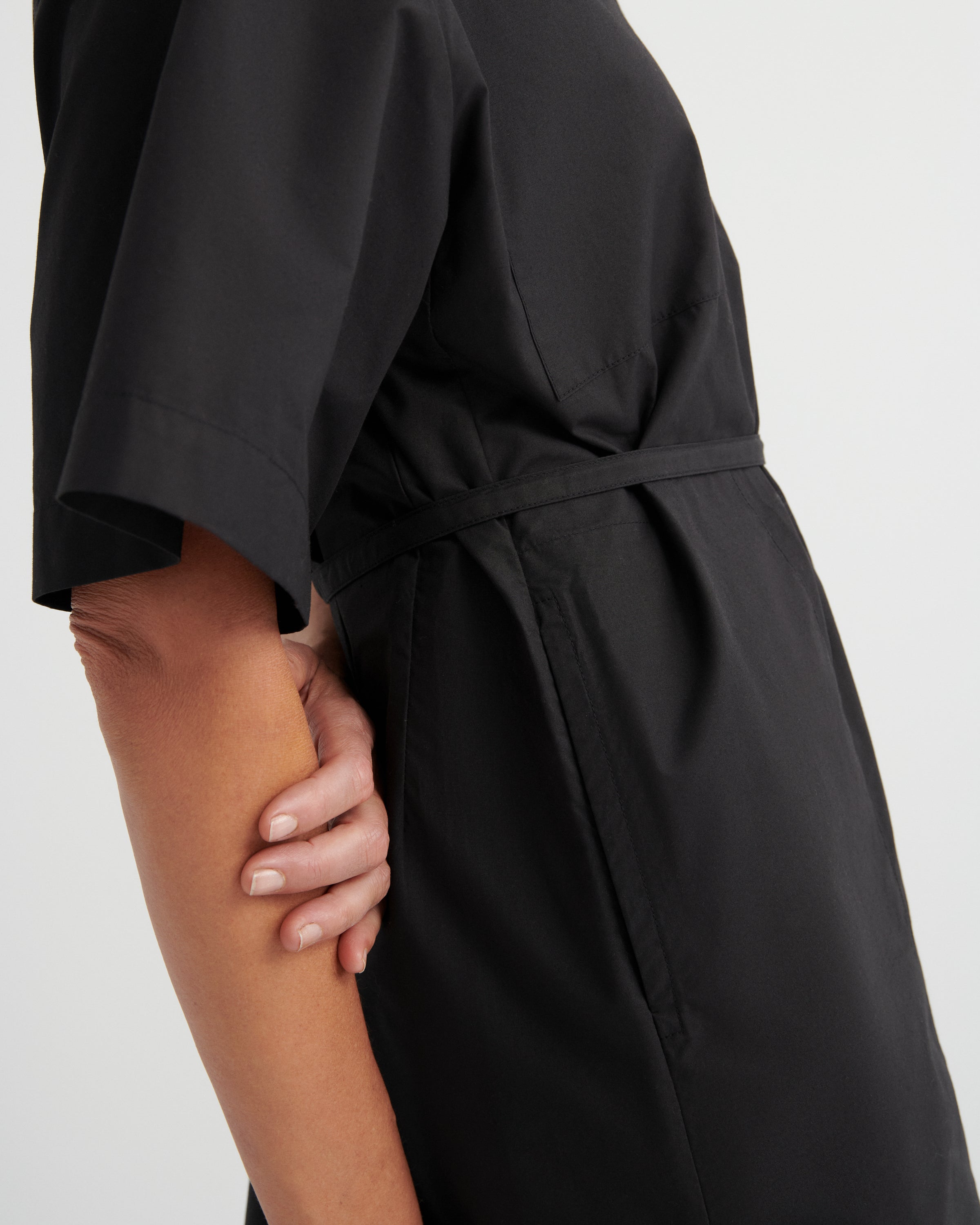 An oversized shirt dress designed for ease, finished with pockets throughout and a classic collar. It fastens with nut buttons down the front placket and can be worn shaped with the belt or loose for effortless styling.