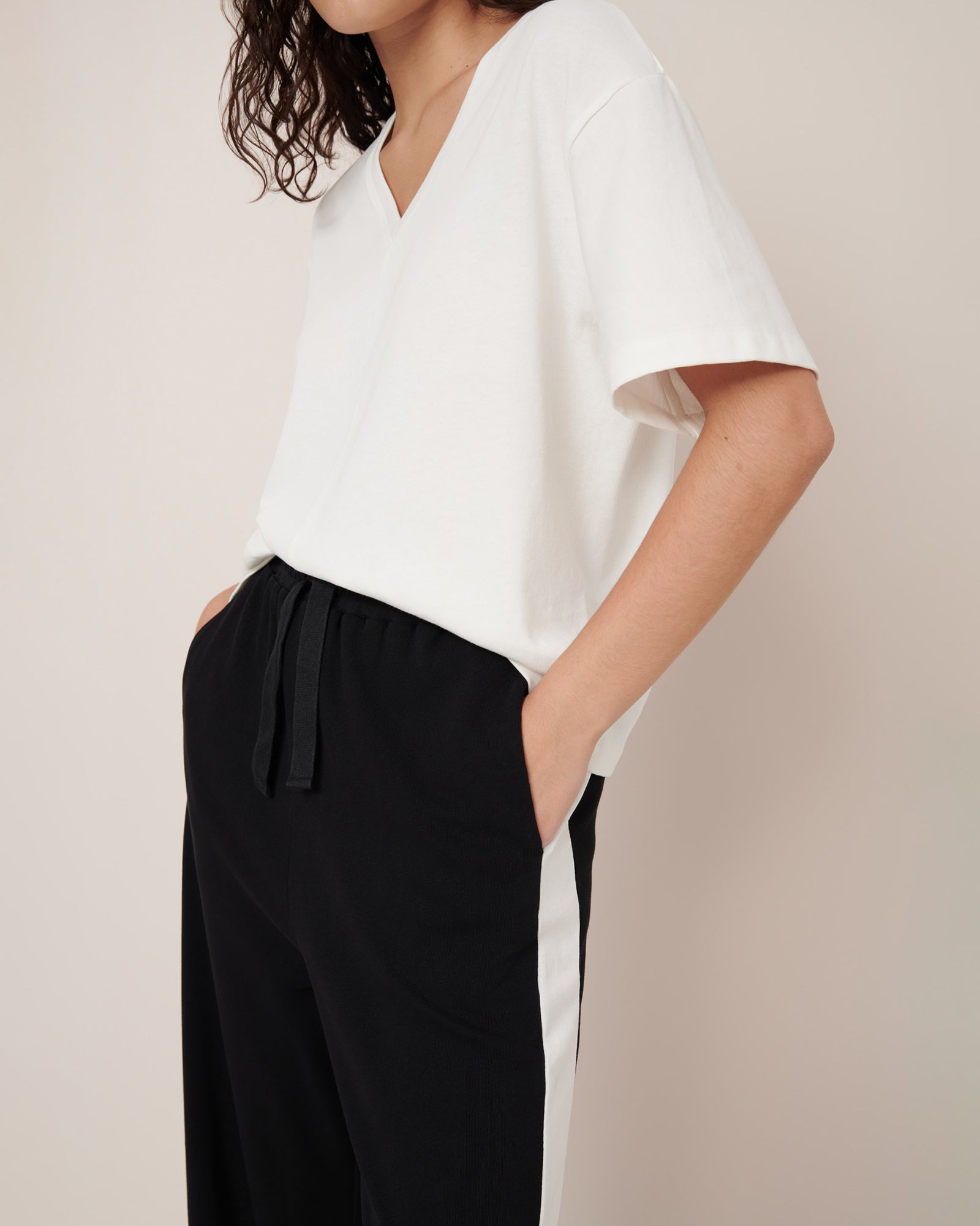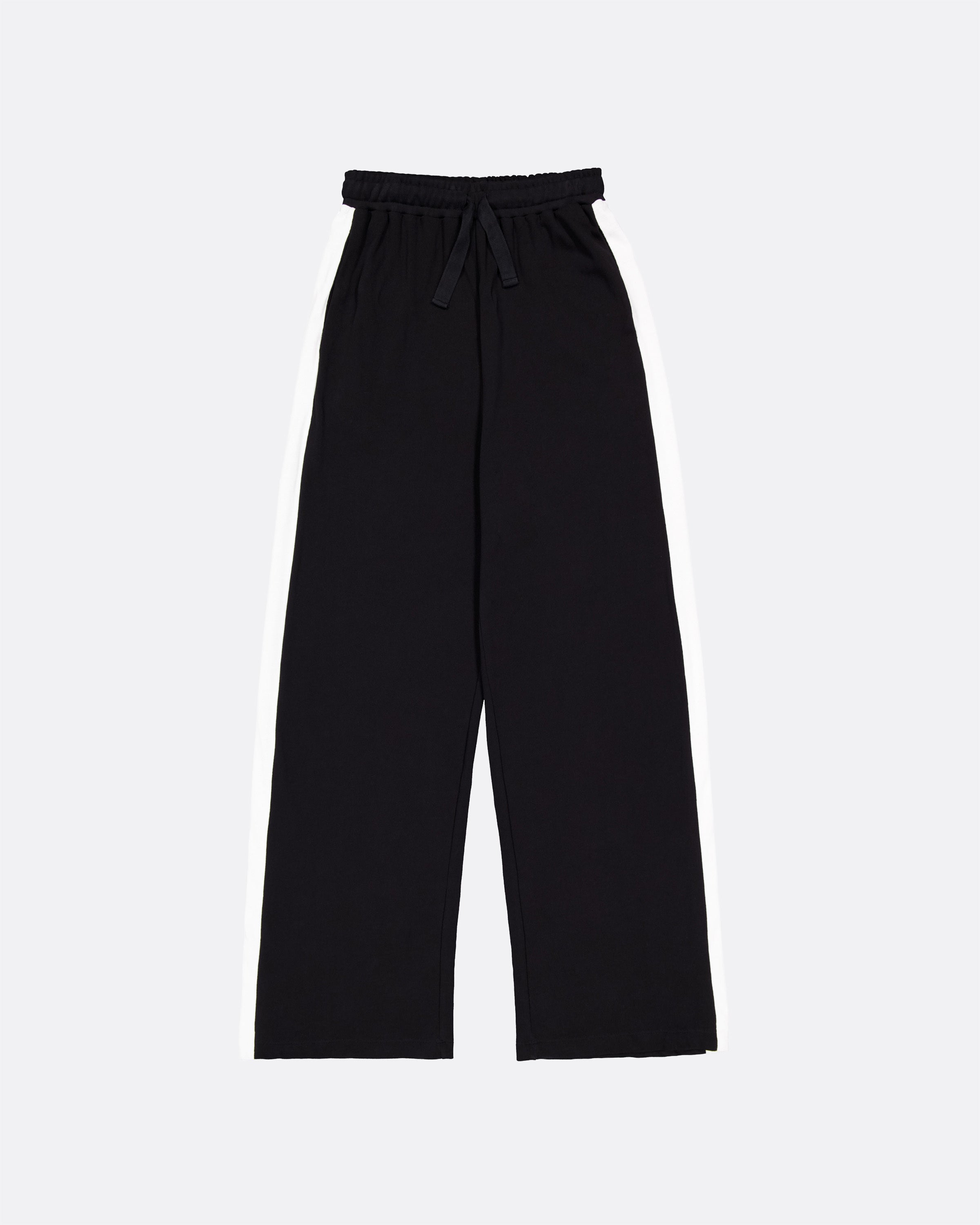 A casual trackpant style detailed with an exaggerated contrast stripe, inspired by vintage tuxedo trousers. The Contrast Trackpants have a straight leg with a relaxed, high-rise fit. Made from heavy-weight organic cotton jersey, they have a comfortable elastic waistband, a functional drawcord and inseam pockets. Wear them on their own or pair with the Contrast Hoodie.