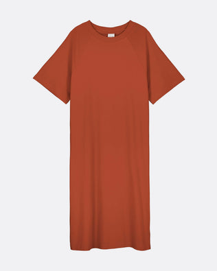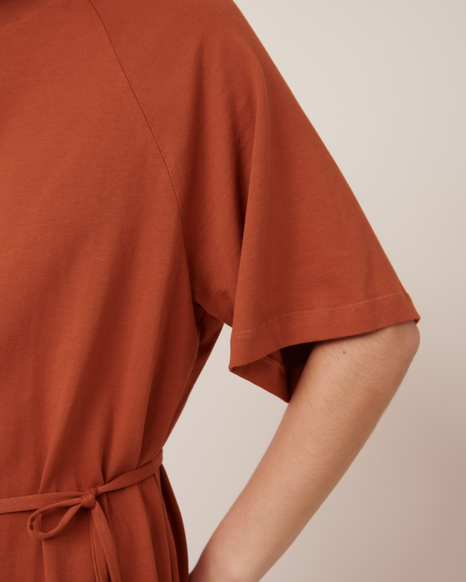 The Raglan Tee Dress features generous raglan sleeves, a generous crew neckline and a boxy, oversized fit. It comes with a self-fabric belt, allowing you to cinch the waist for a more defined shape or leave it loose for a casual look. Made in a soft mid-weight jersey in Clay Red, a rich colour inspired by urban landscapes.