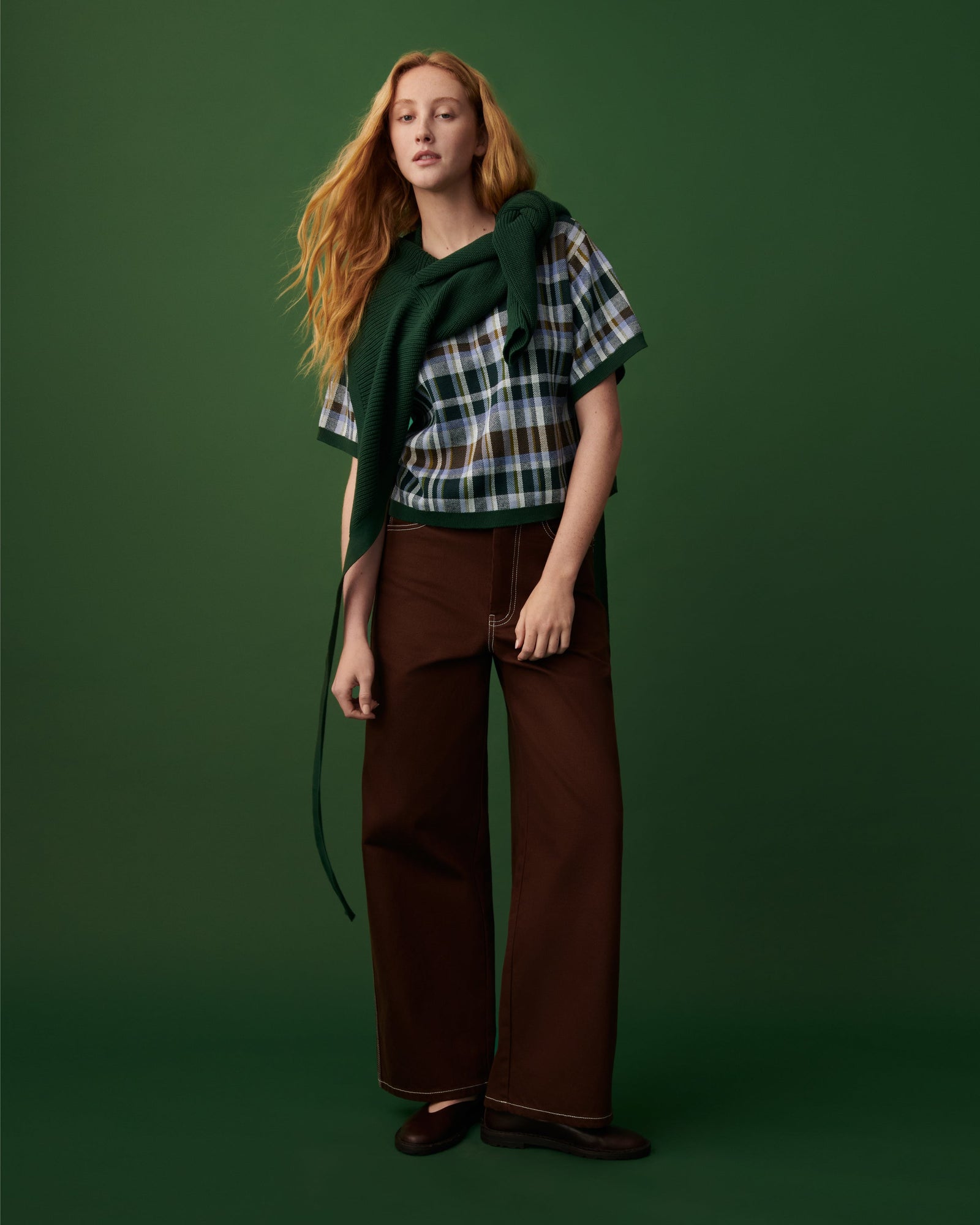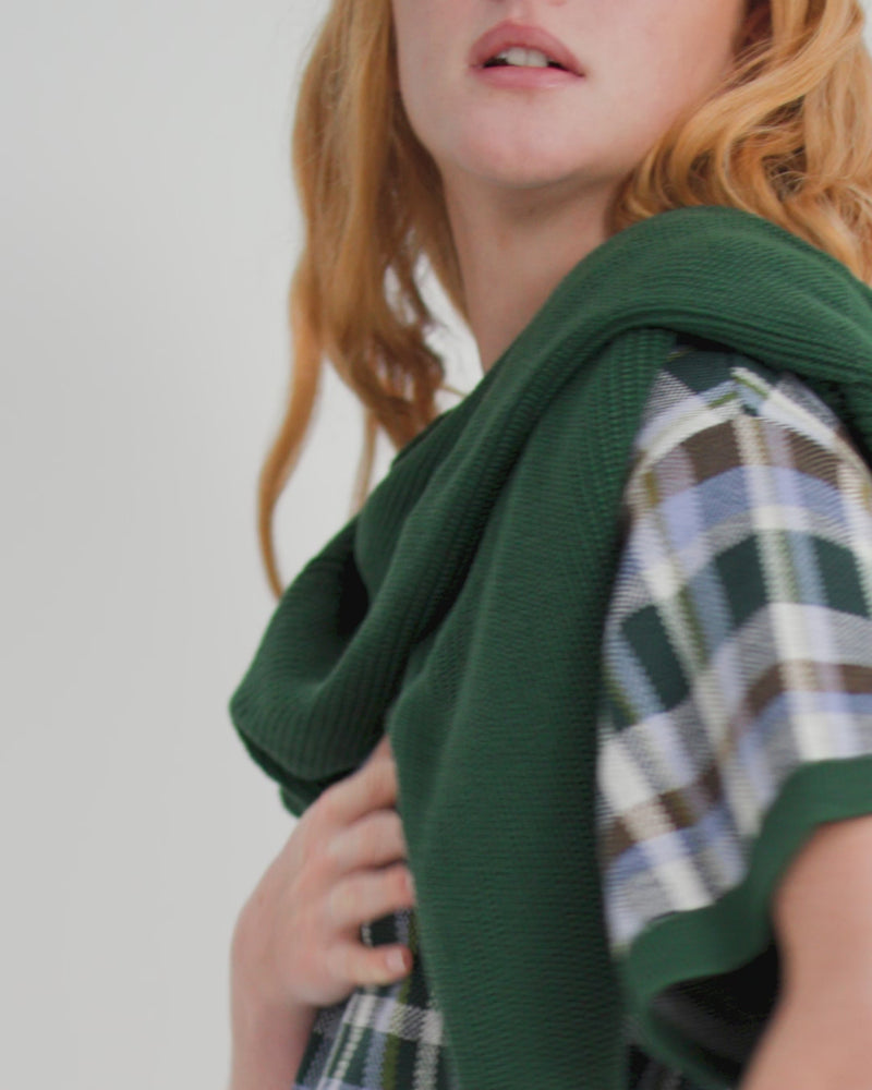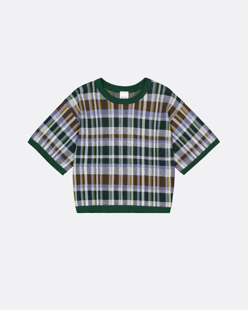 Knit from soft organic cotton, featuring a seasonal check pattern with drop shoulders and a boxy silhouette. Contrast forest-green ribbing at the neck, cuffs, and hem adds a refined finish to its relaxed, everyday shape.