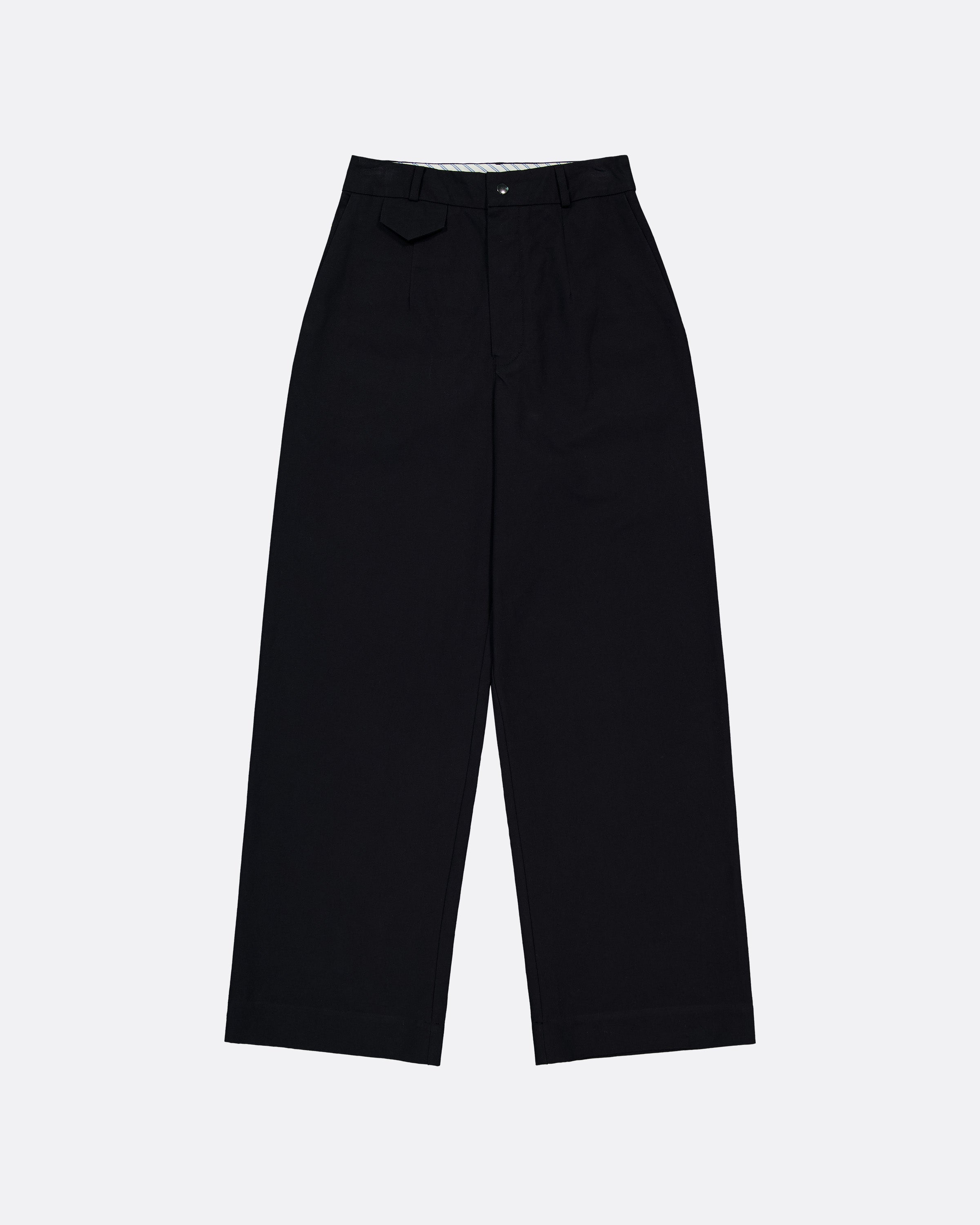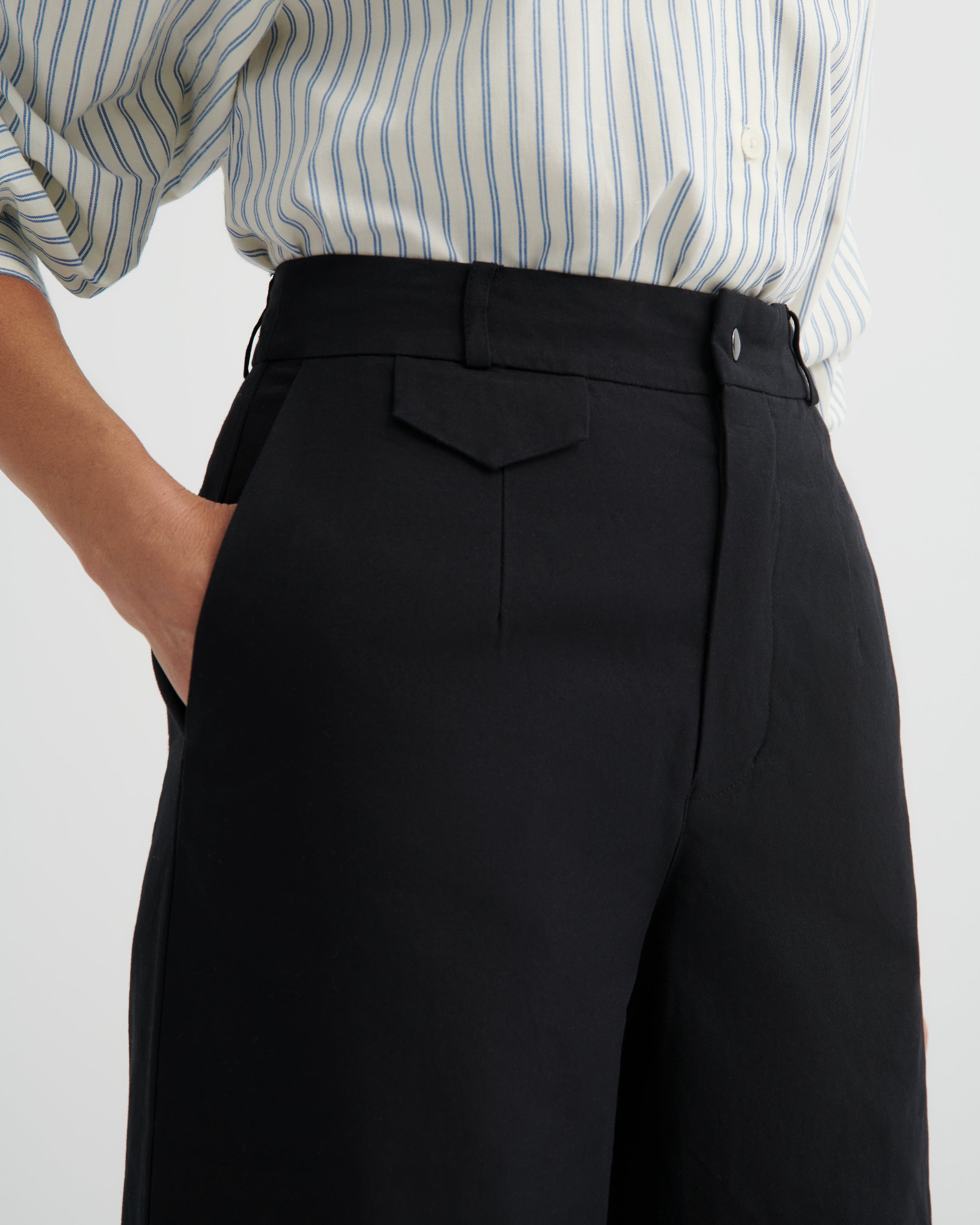 Shaped by darts for a clean, structured fit with a straight-leg silhouette and a fitted waistband. Details include a button fly, belt loops, and pockets, with a contrast stripe lining on the inner waistband. Pairs seamlessly with the Composition Blazer for polished versatility.