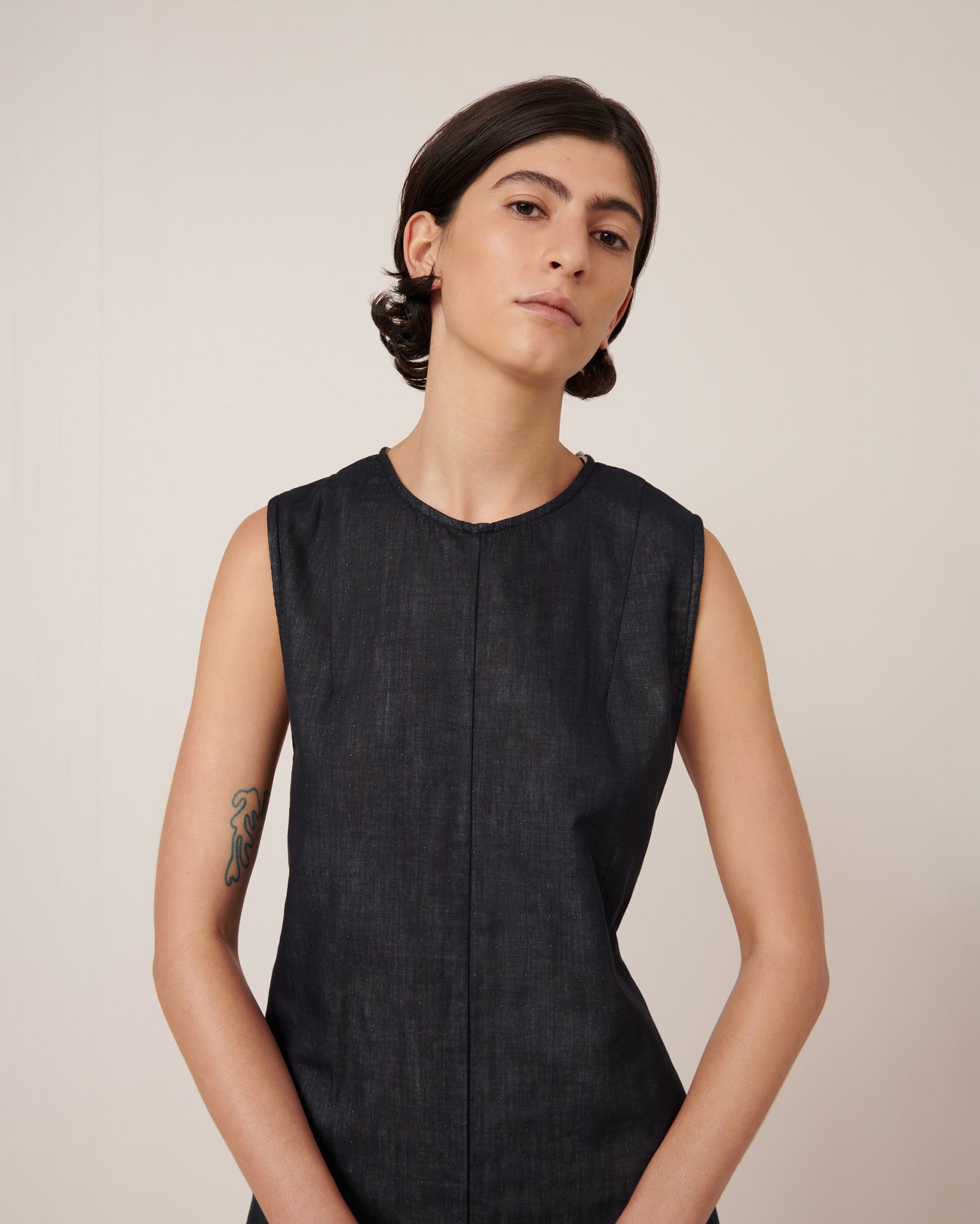 The Ensemble Dress is a versatile, beautifully draped style, crafted from a soft organic cotton double cloth. The twisted back detail creates a soft drape, while the side split adds ease and movement. The shoulder darts through the shoulder create shaping. Designed for a standard fit, it features a shell button opening at the neck. This midi-length dress can be worn alone or styled over your favourite tee.