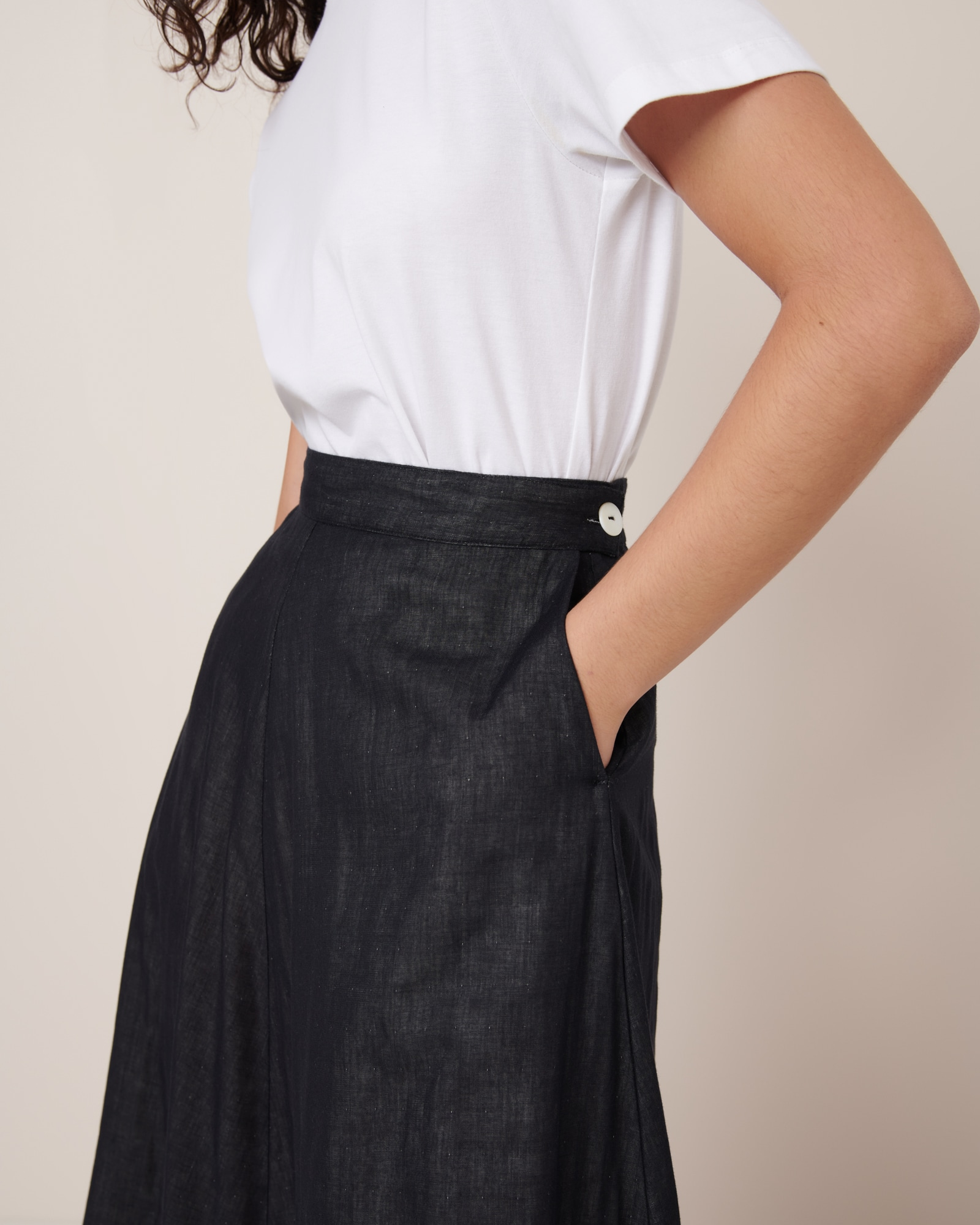 The Rotation skirt offers a classic a-line silhouette, crafted from soft organic cotton double cloth for a refined yet comfortable feel. Designed with a fitted waistband with a nut button closer and practical side seam pockets. With a standard fit that falls to ankle length, this versatile peice pairs effortlessly with any wardrobe staple.
